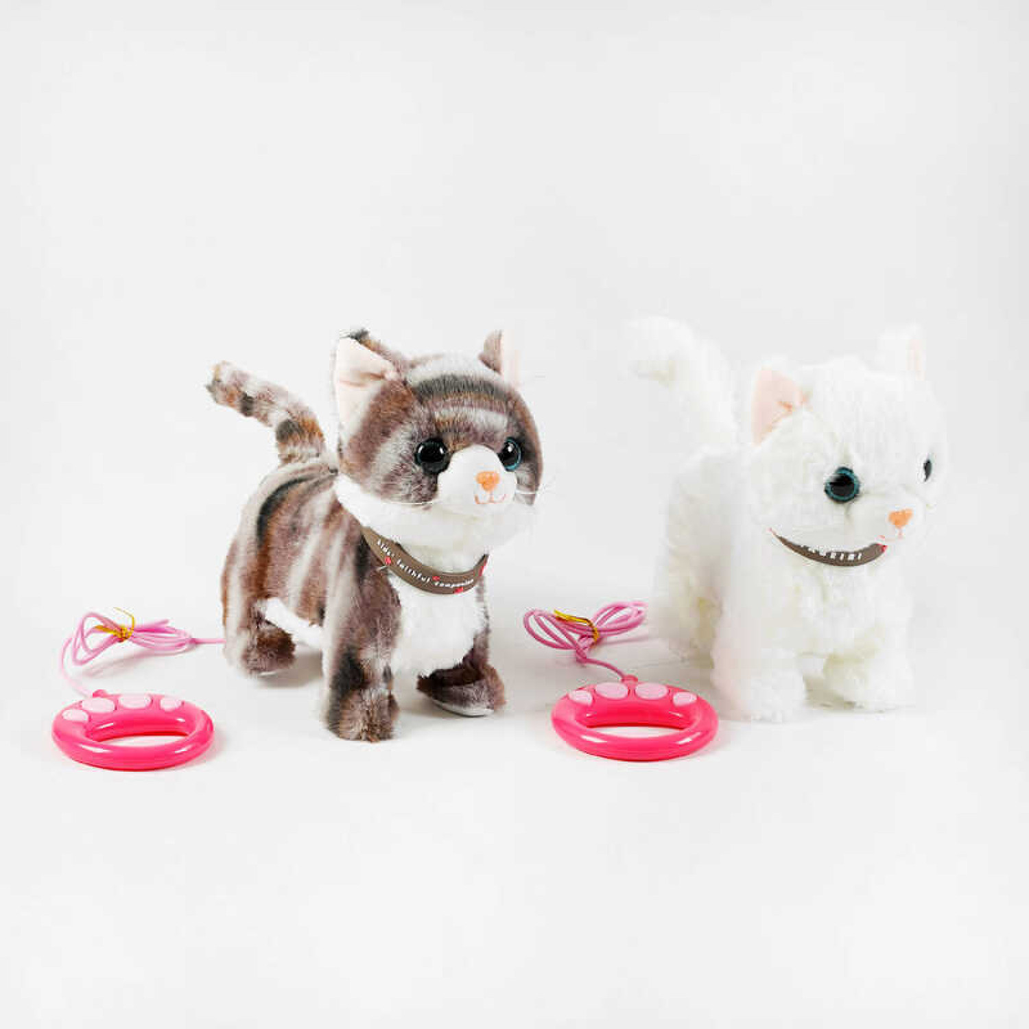 Особливості: Тип живлення - 3 батарейки "АА" (не додаються). Котик ходить та виляє хвостиком. При натисканні на кнопку повідка котик починає рухатись і виляти хвостиком. Повторне натискання зупиняє рух іграшки, а наступне натискання знову активує рух і відтворення іншого звуку або пісні. Співає пісні англійською мовою. Реагує на дотик кумедними звуками. Розєм для підєднання повідка розташований у спині іграшки (за спеціальним розрізом на хутрі).