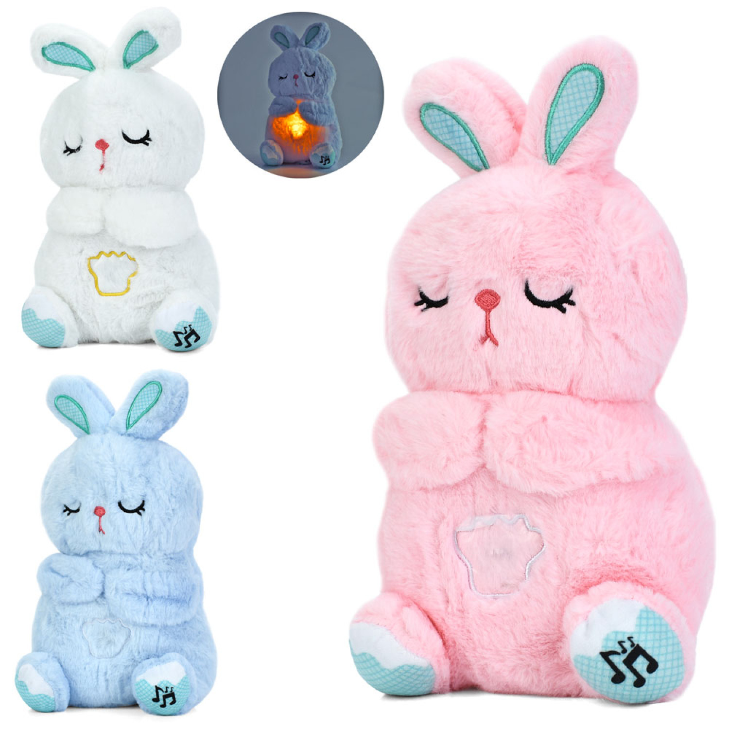 Нічник зайчик, 26-15-10см, світло, музика, дихає, м'яка іграшка, плюш, 3 кольори, на бат-ці, у п/е /50/