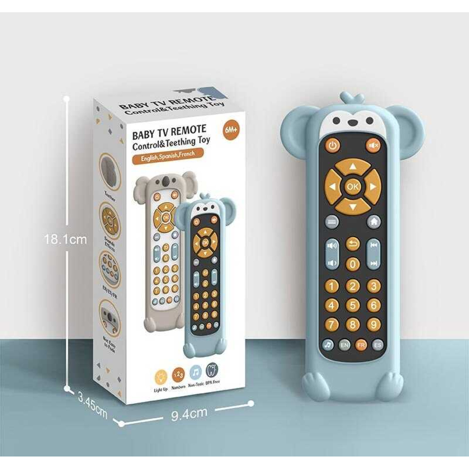 Особливості: Працює від 2 батарейок типу ААА (в комплект не входять). Підсвічування, звуки, мелодії. Озвучування цифр англійською, іспанською та французькою мовою. Розмір: 8.5х17 см. Кнопка з нотою слугує перемикачем режимів звуку. Дизайн кнопок як на справжньому пульті. Гумові безпечні кнопочки. Гумовий чохол. Яскравий дизайн.
