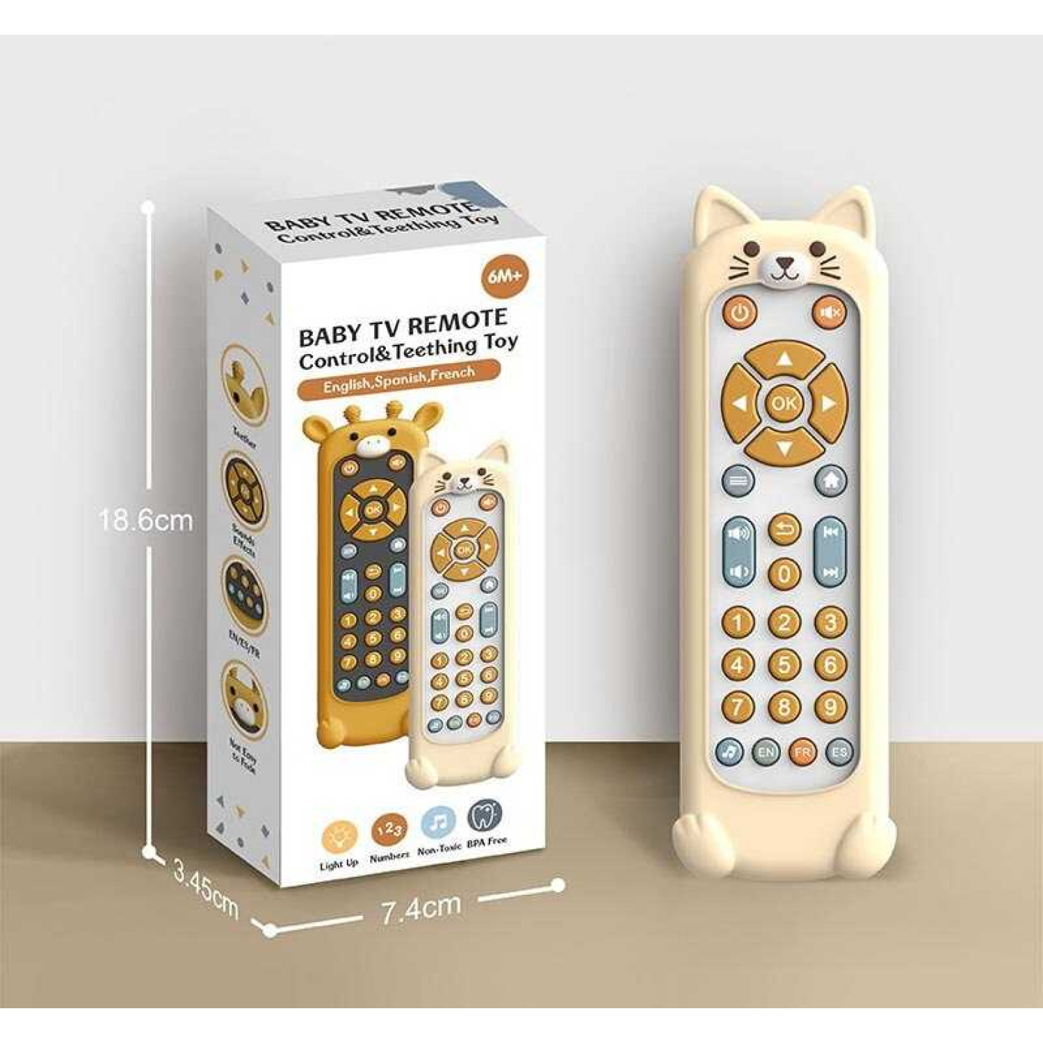 Особливості: Працює від 2 батарейок типу ААА (в комплект не входять). Підсвічування, звуки, мелодії. Озвучування цифр англійською, іспанською та французькою мовою. Розмір: 8.5х17 см. Кнопка з нотою слугує перемикачем режимів звуку. Дизайн кнопок як на справжньому пульті. Гумові безпечні кнопочки. Гумовий чохол. Яскравий дизайн.