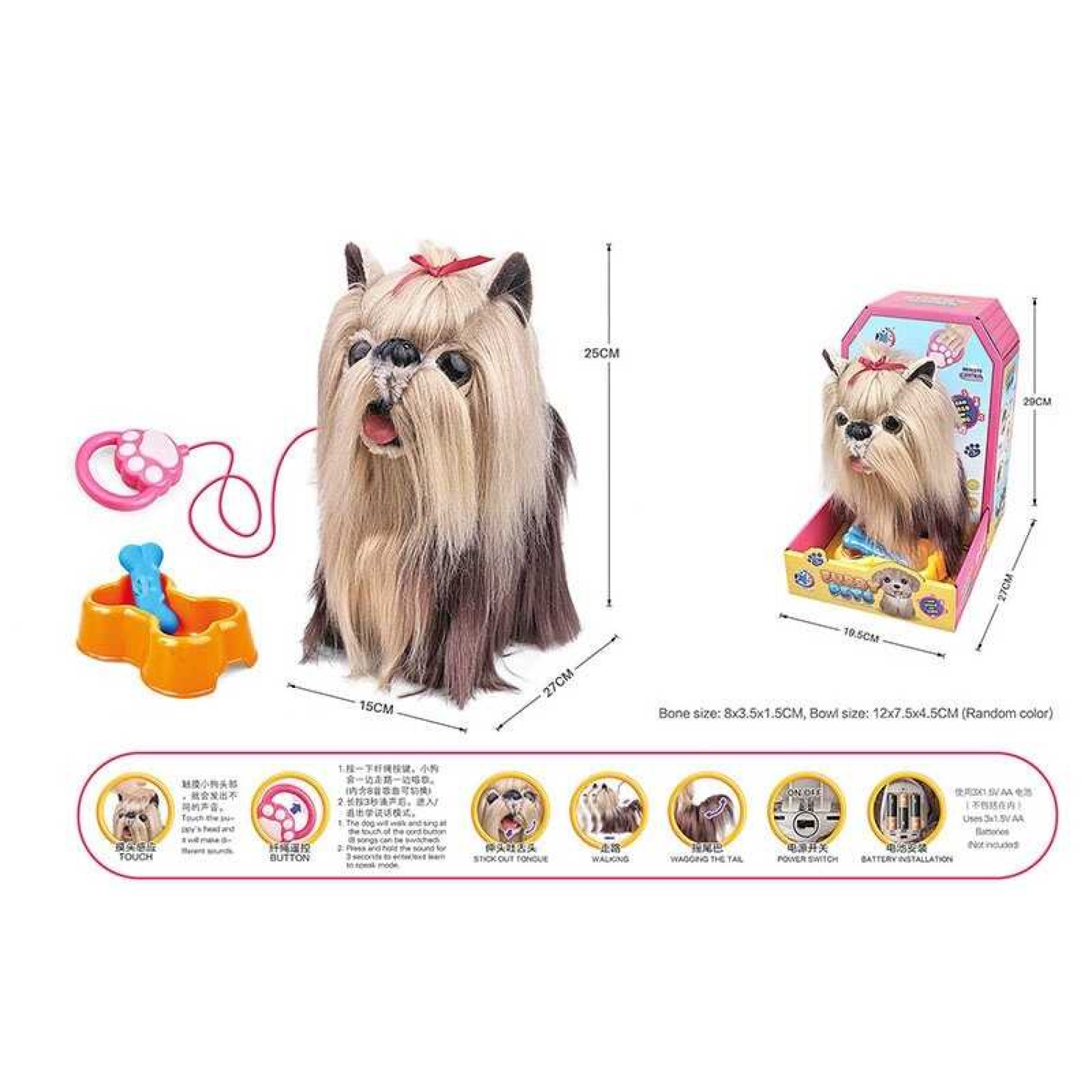 Особливості: Працює від 3 батарейок типу АА (не входять у комплект). Інтерактивна собачка на повідку. Звук і музика. Ходить, махає хвостиком та облизує. Запис і відтворення голосу. Сенсорний датчик на голові реагує на дотики. Кісточка та мисочка в комплекті. Розмір: 15х27х25 см.