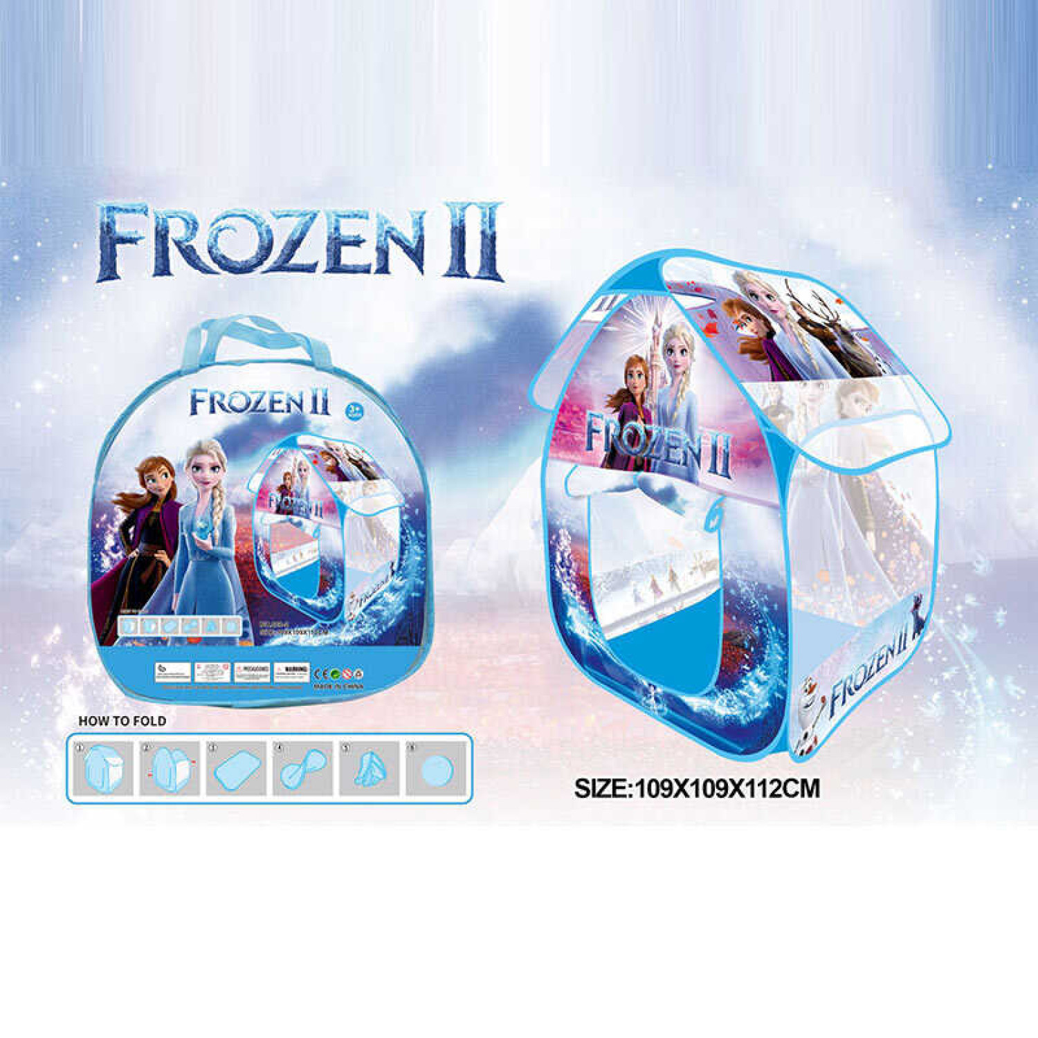 Особливості: Тематичний намет із зображенням героя. Каркас намету з металевими стрижнями. Двері відкриваються та фіксуються. Вставки із сітки з боків у вигляді вікон. Складається легким рухом руки в спеціальну сумку. Розмір намету у розкладеному вигляді: 109х109х112 см.