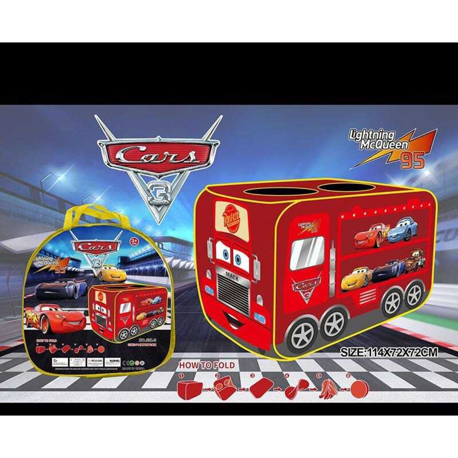 Особливості: Намет виконаний у вигляді тематичного автомобіля. Каркас намету з металевими стрижнями. 2 круглих вікна на стелі. Складається легким рухом руки в спеціальну сумку. Розмір намету у розкладеному вигляді: 114х72х72 см.