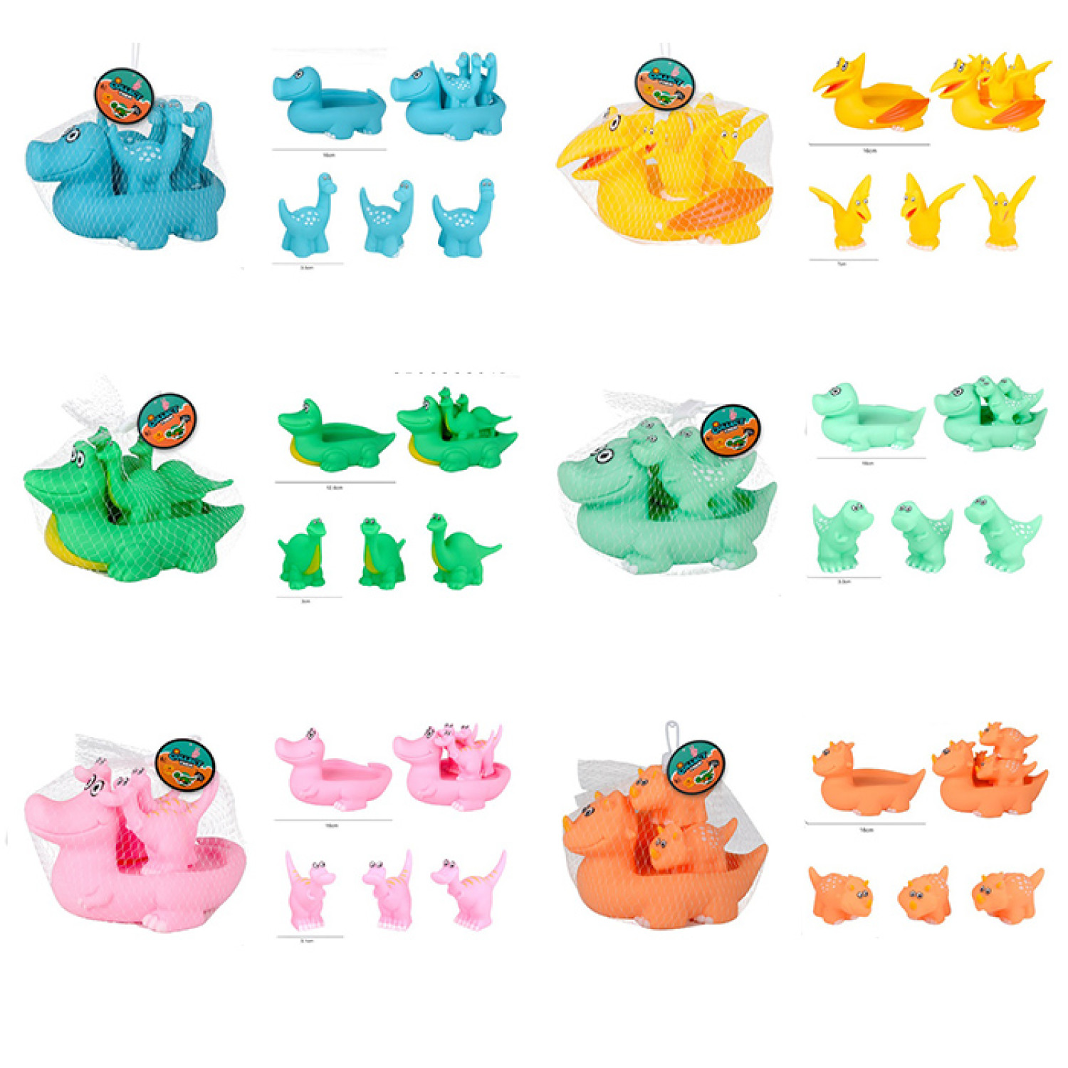 Іграшка для купання динозавр, сім'я динозаврів, набір 4шт(16см, 7см), пискавка, 6 видів, в сітці, 17-14-12см /84/