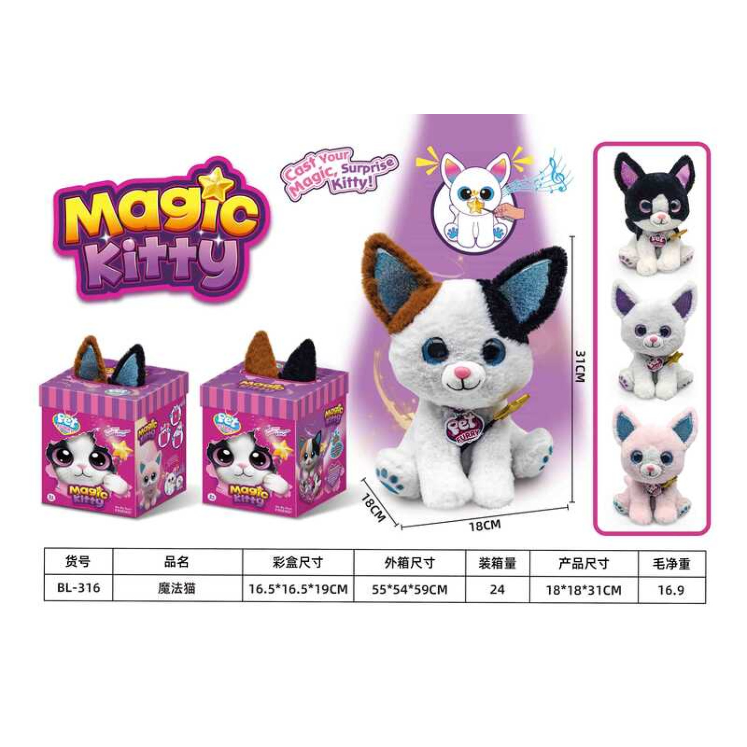 Особливості: Розмір інтерактивної тваринки 18х13х24.5 см. Вушка підсвічуються різними кольорами, варто лише доторкнутися чарівною паличкою до носика. Відтворює звуки та короткі мелодії, вони змінюються з кожним новим дотиком палички. На лапці наявна кнопка, що відтворює пісні англійською. Великі пластикові оченята. Ефекти працюють від 3-х батарейок АА (не додаються). Виконано з приємного на дотик текстилю.