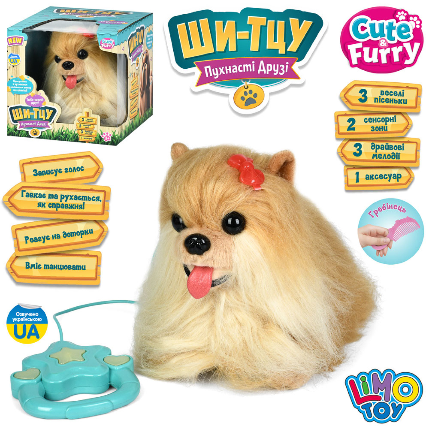 Собака Ши-тцу, д/к(повідець), 28-19-19см, сенсорна, музика-звук(укр), звук(гавкає), 3 пісні, їздить, танцює, повтор, 2 режими, на бат-ці, в кор-ці(разобр), 21-20,5-25см /12/