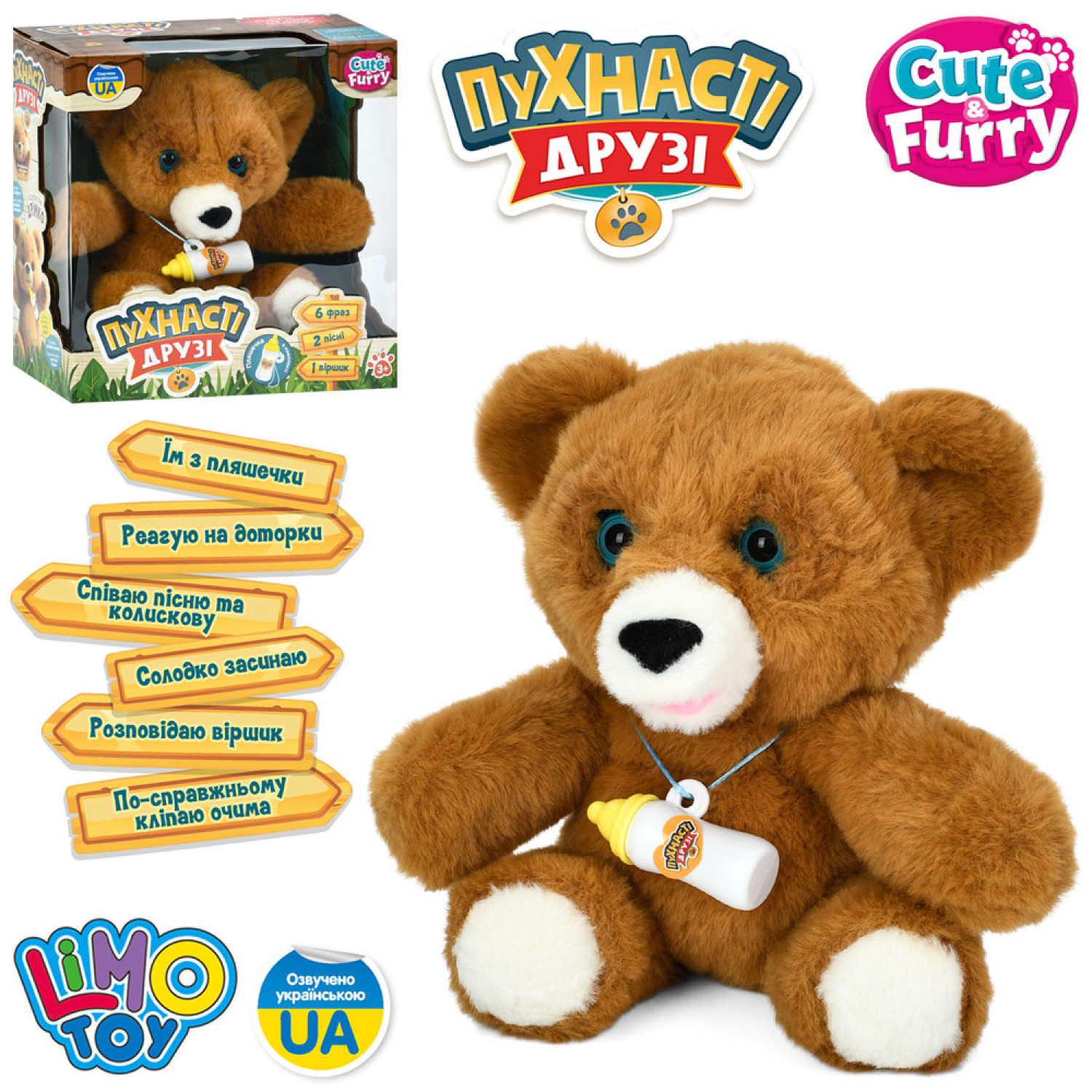 Тварина ведмедик, 24см, музика-звук(укр), пісні, віршик, сенсорний, спить, реагує пляшечку, плюш, на бат-ці, в кор-ці, 22-22,5-13,5см /16/