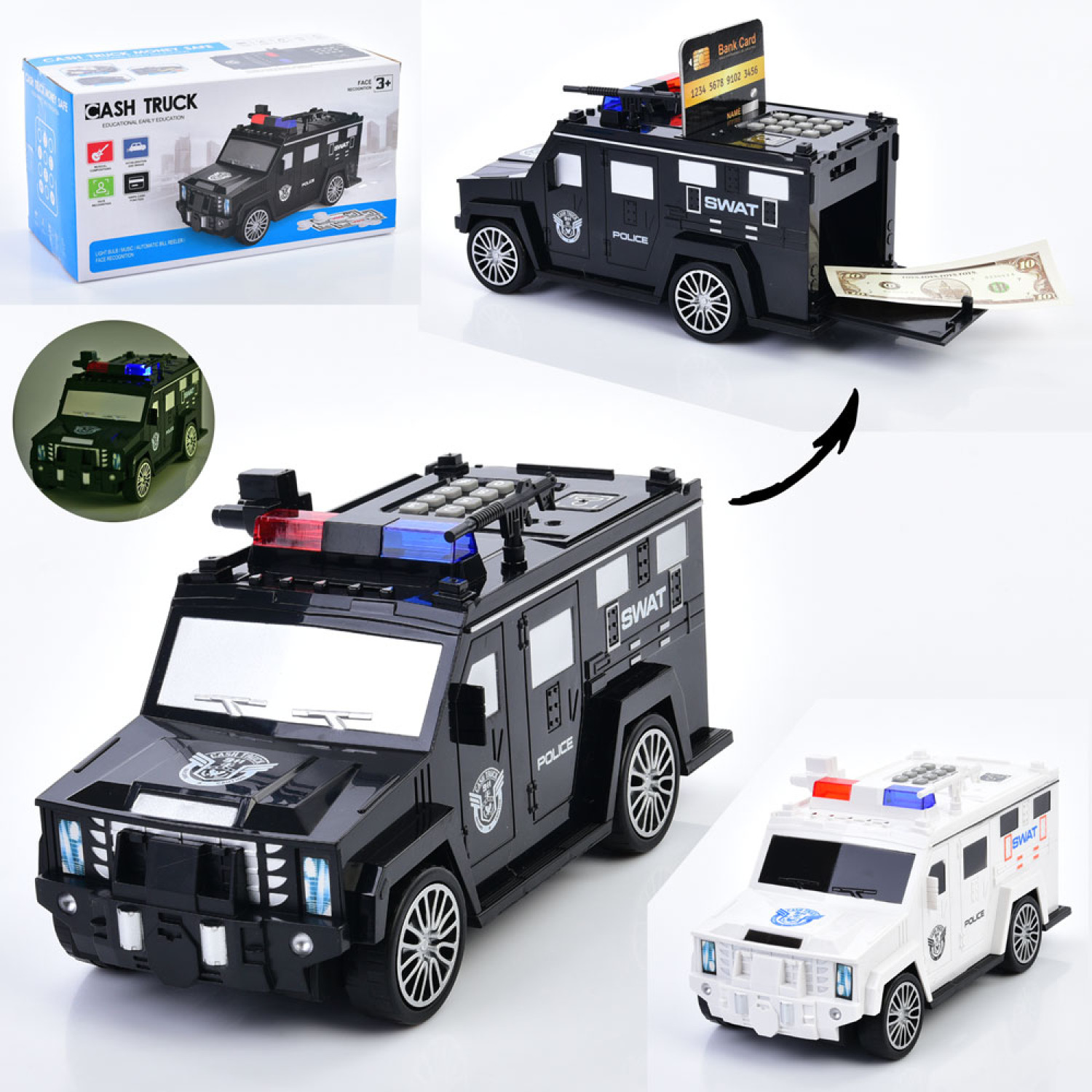 Машина 26см, поліція, сейф з кодом, затягує купюри, звук, світло, 2 кольори, на бат-ці, в кор-ці, 28,5-15-13,5 /18/