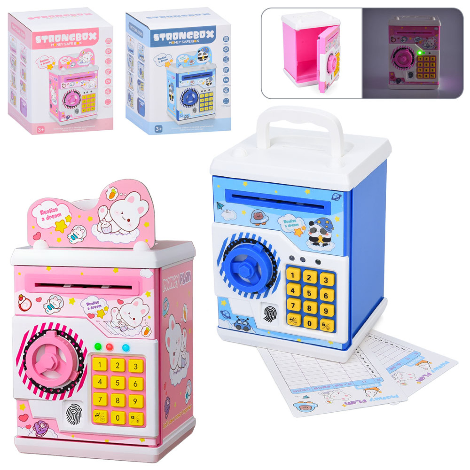 Скарбничка-сейф поєднує функції дитячого сейфа та інтерактивної іграшки. Модель обладнана цифровою клавіатурою з кодовим замком і сенсорною панеллю, що імітує відбиток пальця. Під час використання активуються звукові та світлові ефекти, а механізм автоматично затягує купюри у приймальний отвір. Розмір: 12,5х18х11,5 см розмір упаковки: 14х18,5х14 см.