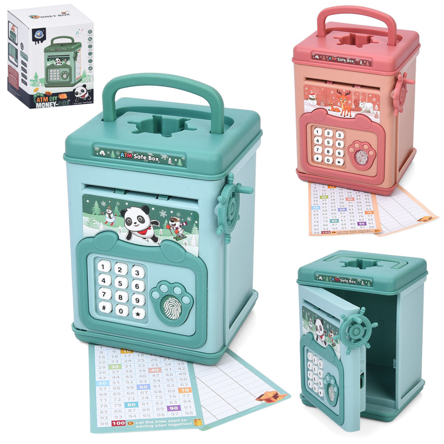 Електронна скарбничка виконана у вигляді мініатюрного сейфа з цифровим кодовим замком і функцією звукового супроводу. Модель обладнана клавіатурою для введення пароля та сенсорною панеллю з імітацією відбитка пальця. Пристрій відтворює музику та англійські голосові підказки під час відкриття дверцят або взаємодії з кнопками. У верхній частині корпусу розташований отвір для монет і купюр. Розмір: 11х16х10 см Розмір упаковки: 12х16х11 см Живлення: від батарейок.