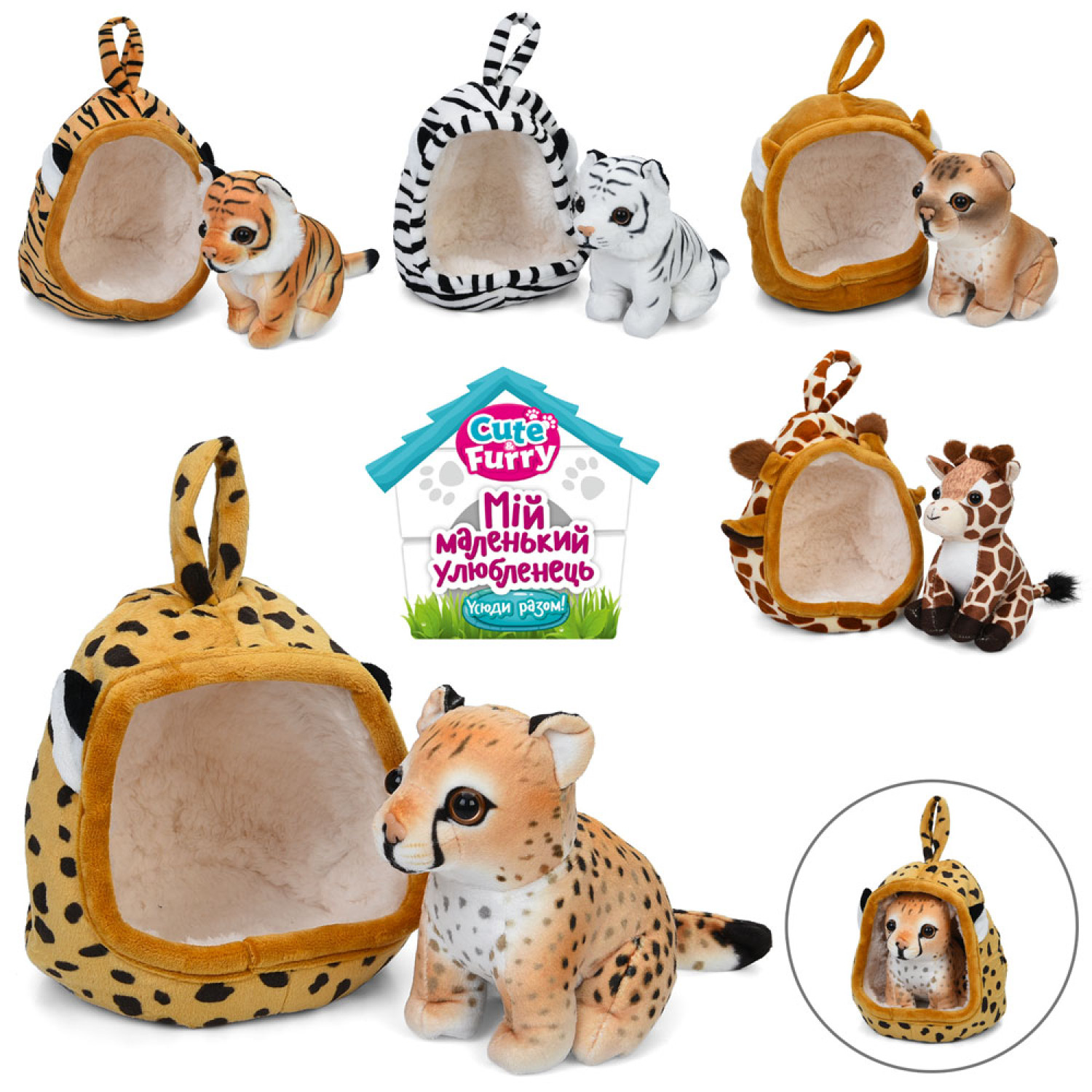 М'яка іграшка тварина, 13см, переноска/будиночок (з петелькою) 24см, плюш, 5 видів (жираф, лев, леопард, тигр-2кольори), у п/е /42/