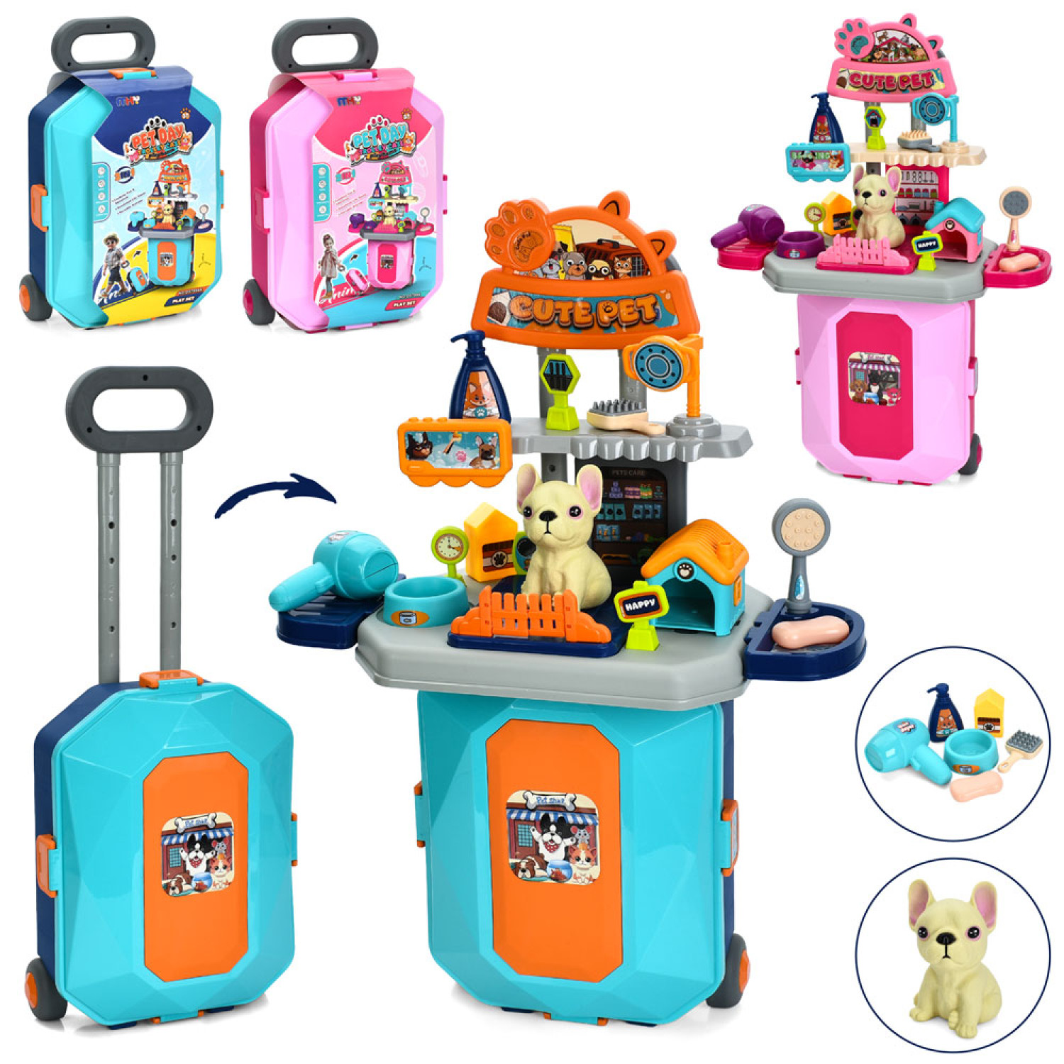 Набір гральний «грумер» стіл 46-24-в66см, складається в чемодан (ручка, 2 колеса), фен, гребінець, аксесуари, собака 11см, 2види, в карт.обгортці, 26-40-14см /18/