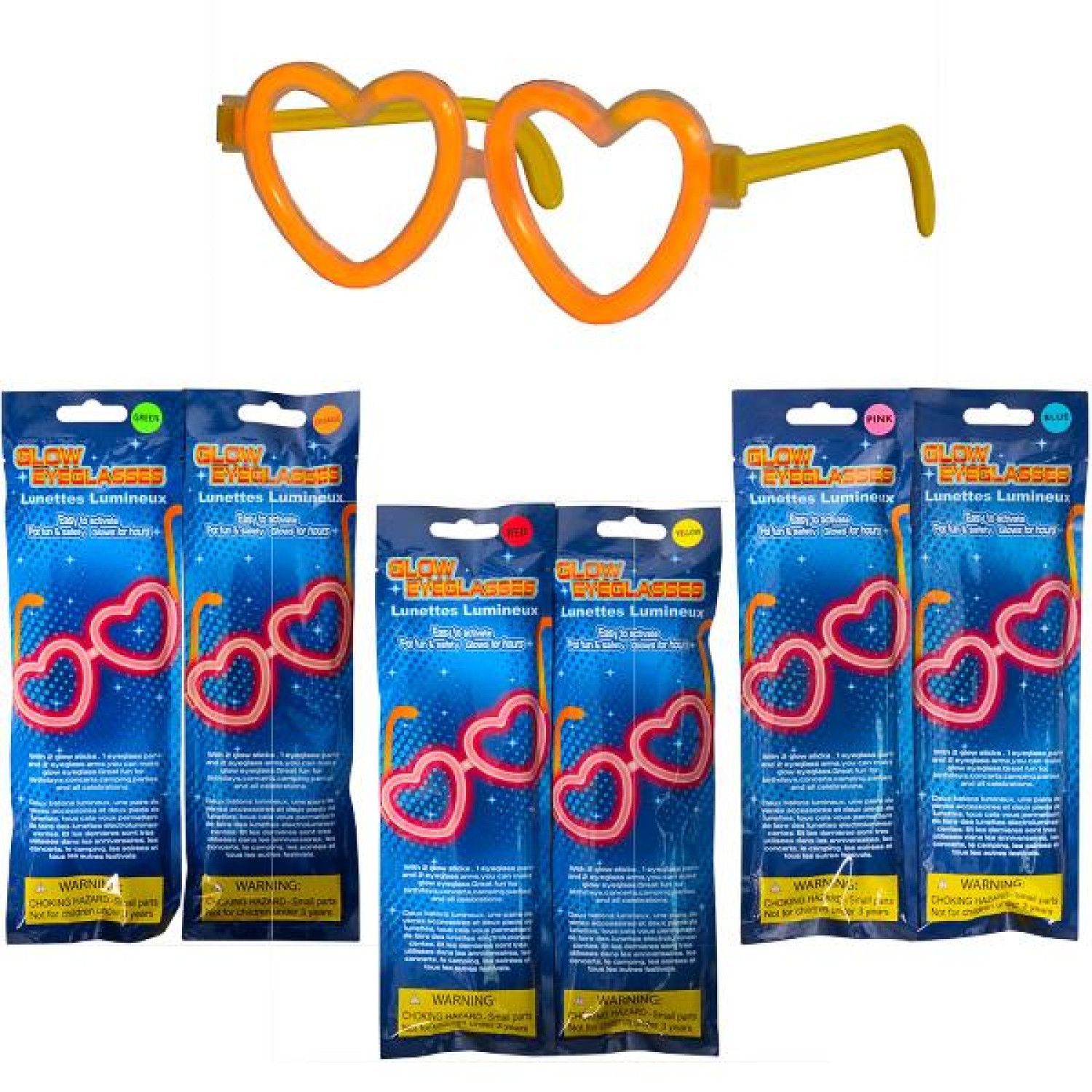 Окуляри мають форму сердечок, в які вставляються світлові браслети. Комплект включає 2 пластикові дужки для зафіксування за вухами, 2 світлові палички розміром 5х200 мм, багаторазові кріплення. Кольори браслетів представлені в асортименті з 6 яскравих варіантів. Розмір окулярів універсальний, підходить як дорослим, так і дітям. Час світіння від 3 до 5 годин. Продукт не містить токсичних речовин.
