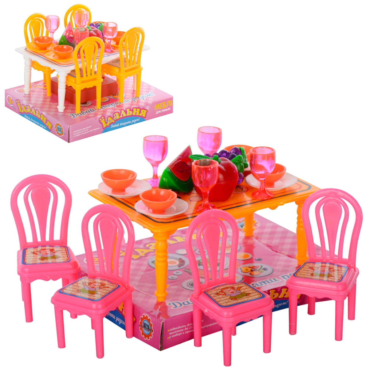 Їдальня стіл, 4 стільця, посуд, фрукти, 2 кольори, в слюді, 13-10-9 см /180/