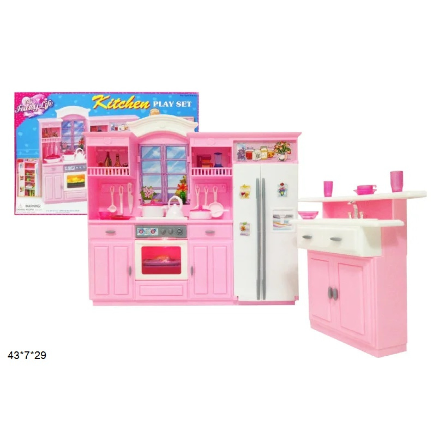 Мебель кукольная Gloria "Кухня", упаковка - коробка. В комплекте детали для сборки кухонного гарнитура, холодильника, раковины с тумбой, посуды. Кукла не входит в комплект. Материал - пластик.