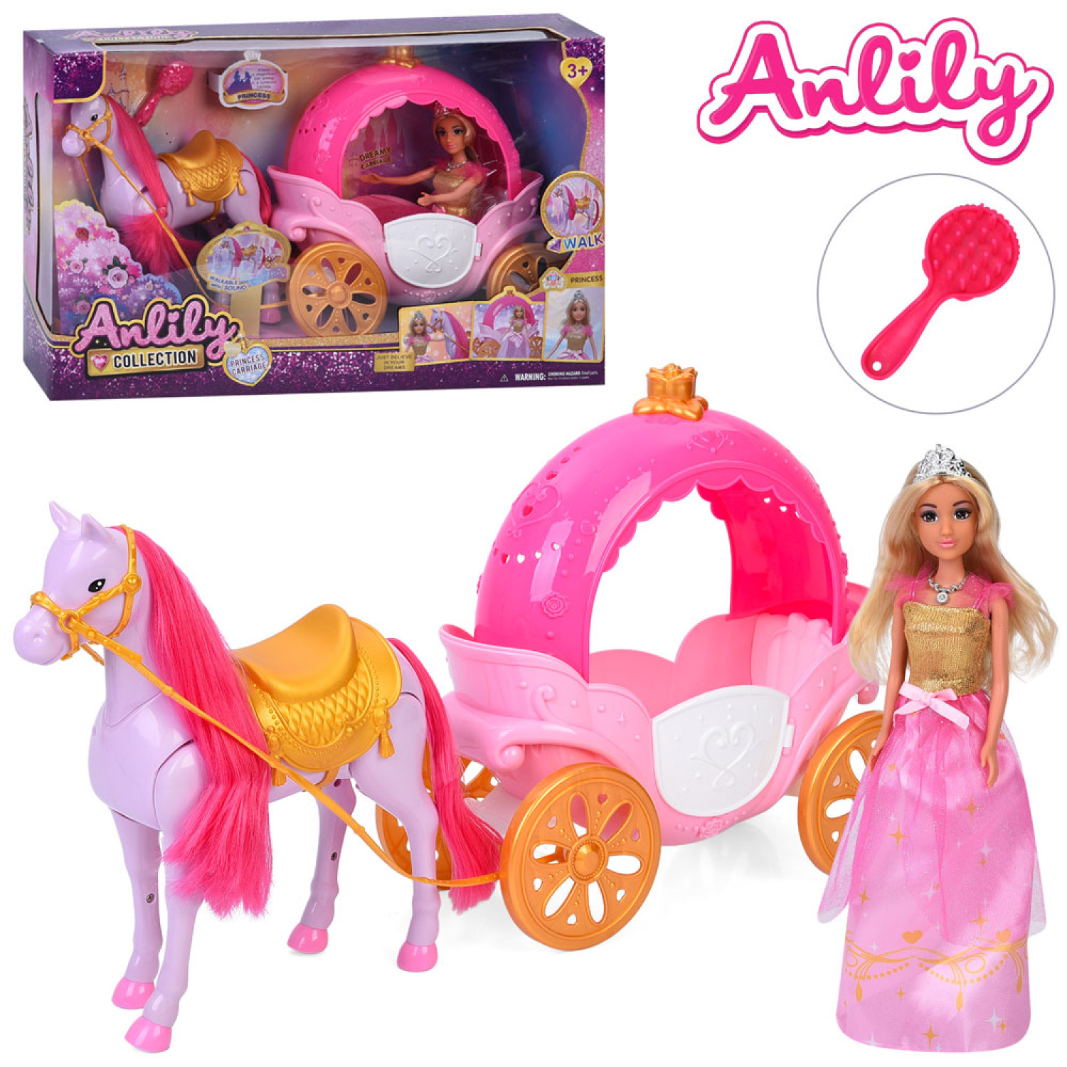 Особливості: Розмір карети 31 см. Конячка розміром 25 см, ходить, видає звуки. Висота ляльки 28 см. Гребінець в комплекті. Упаковка: коробка 57х35х17,5 см.