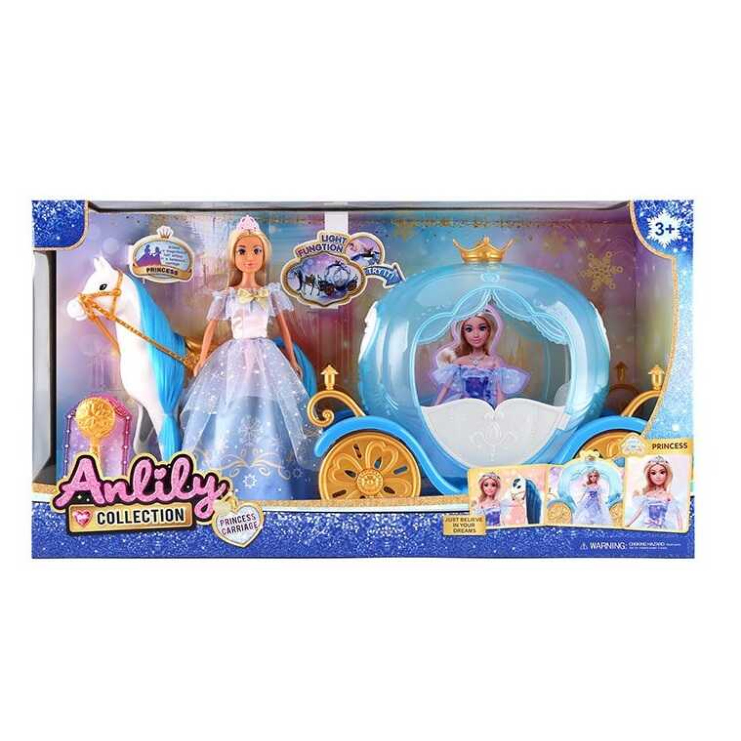Лялька з каретою підсвічування, висота ляльки 30 см, шарнірні кінцівки, намисто, корона, кінь із сідлом, карета, дверцята відчиняються, в кор. /6/