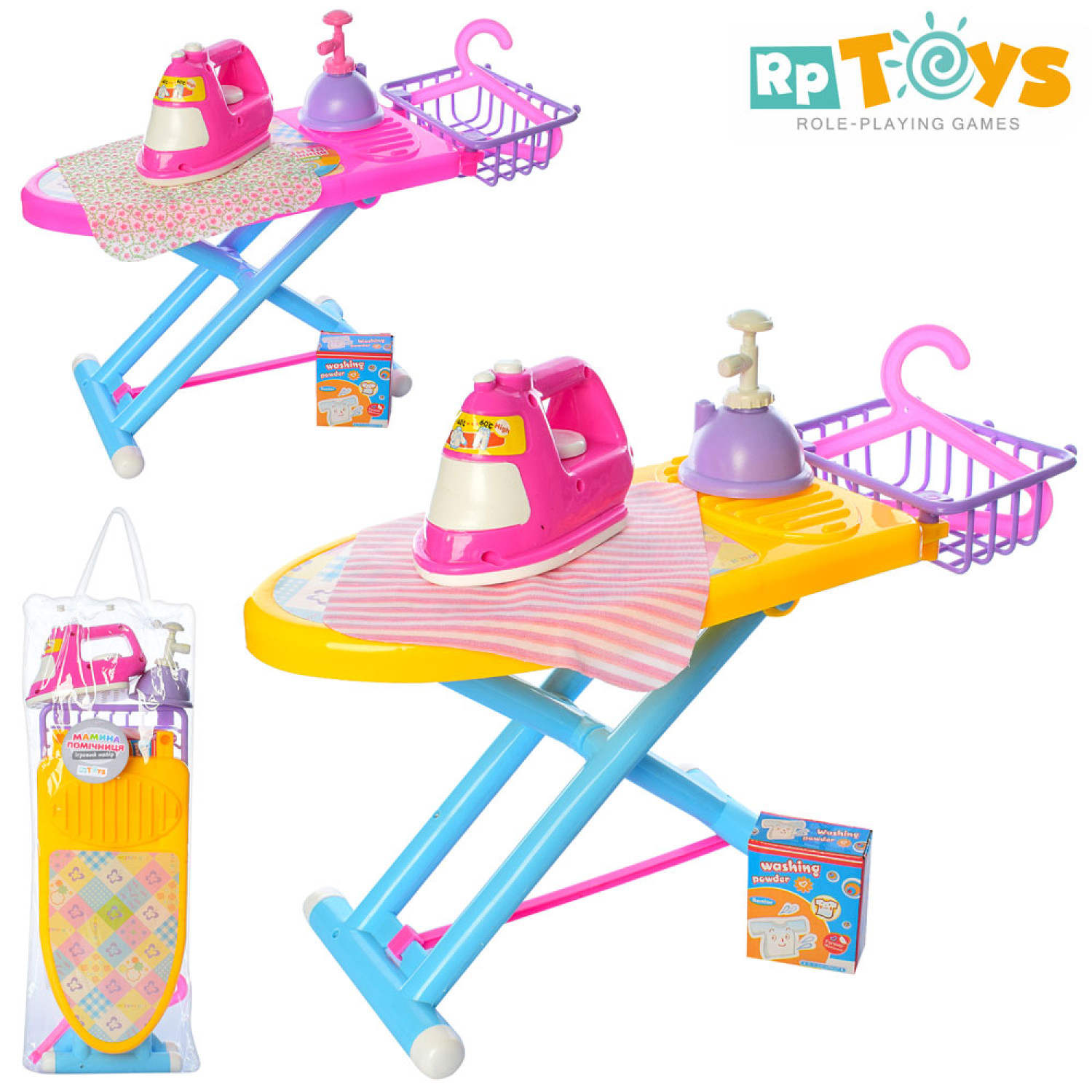 Игровой набор для глажки, упаковка - пакет с хедером. В комплекте: доска гладильная, утюг, распылитель воды, вешалка, корзина, стиральный порошок, полотенце. Размеры утюга 15*10 см. Материалы: пластик, текстиль, картон.