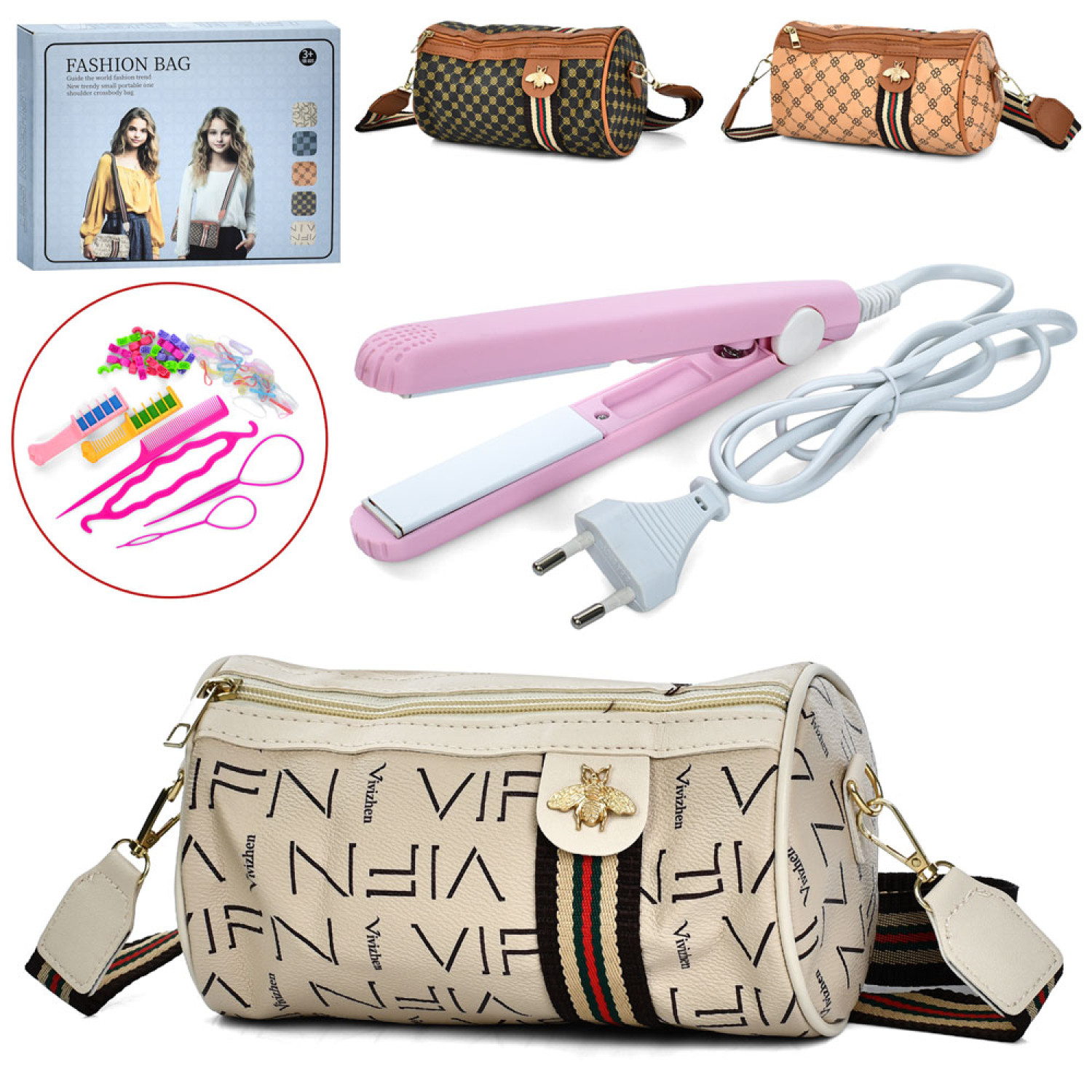 Косметика набір перукаря, плойка(від мережі)/світло/нагрівається, заколки, крейда для волосся 2шт, сумка 19-12-12см/довга ручка, мікс видів, в кор-ці, 28-22-4см /24/