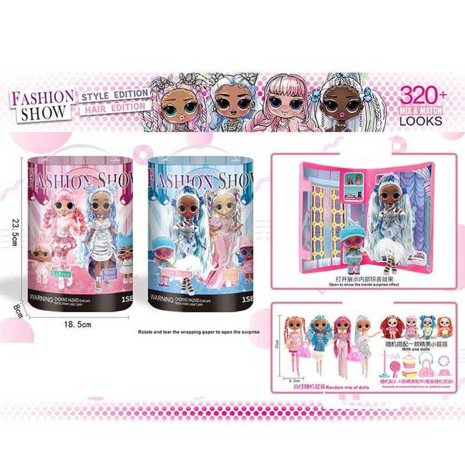 Набір складається з 2-х ляльок - великої та маленької, а також аксесуарів для них. Розмір великої ляльки - 23 см.