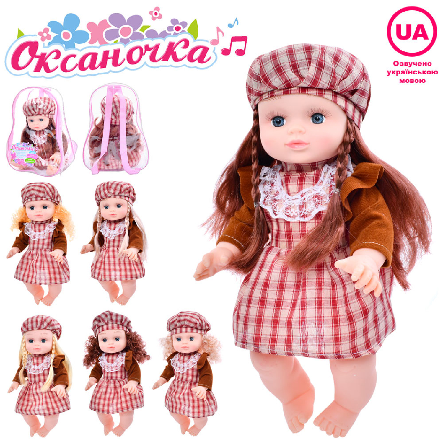 Лялька Оксаночка, 33см, музика-звук (укр), пісня, рахує, гра у схованки,вірш, 6 видів, на бат(табл), в рюкзаку, 21-28-14см /24/