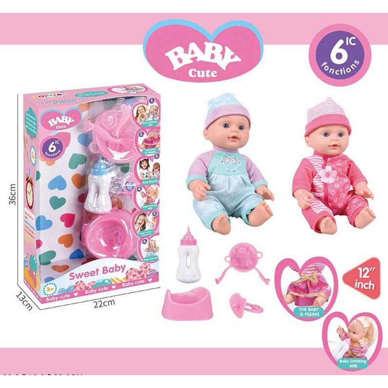 Особливості: Пупсик оснащений 6 функціями. Звуковий чіп активує різноманітні звуки властиві маленькій дитині. Набір доповнений різними аксесуарами для догляду за немовлям: горщик, пляшечка, соска та тарілочка з приладами. Зріст пупса: 33см. Іграшка виконана з комбінованих матеріалів: голова з гуми, а тіло - первинний пластик. Ефекти працюють від батарейок, які входять до комплекту.