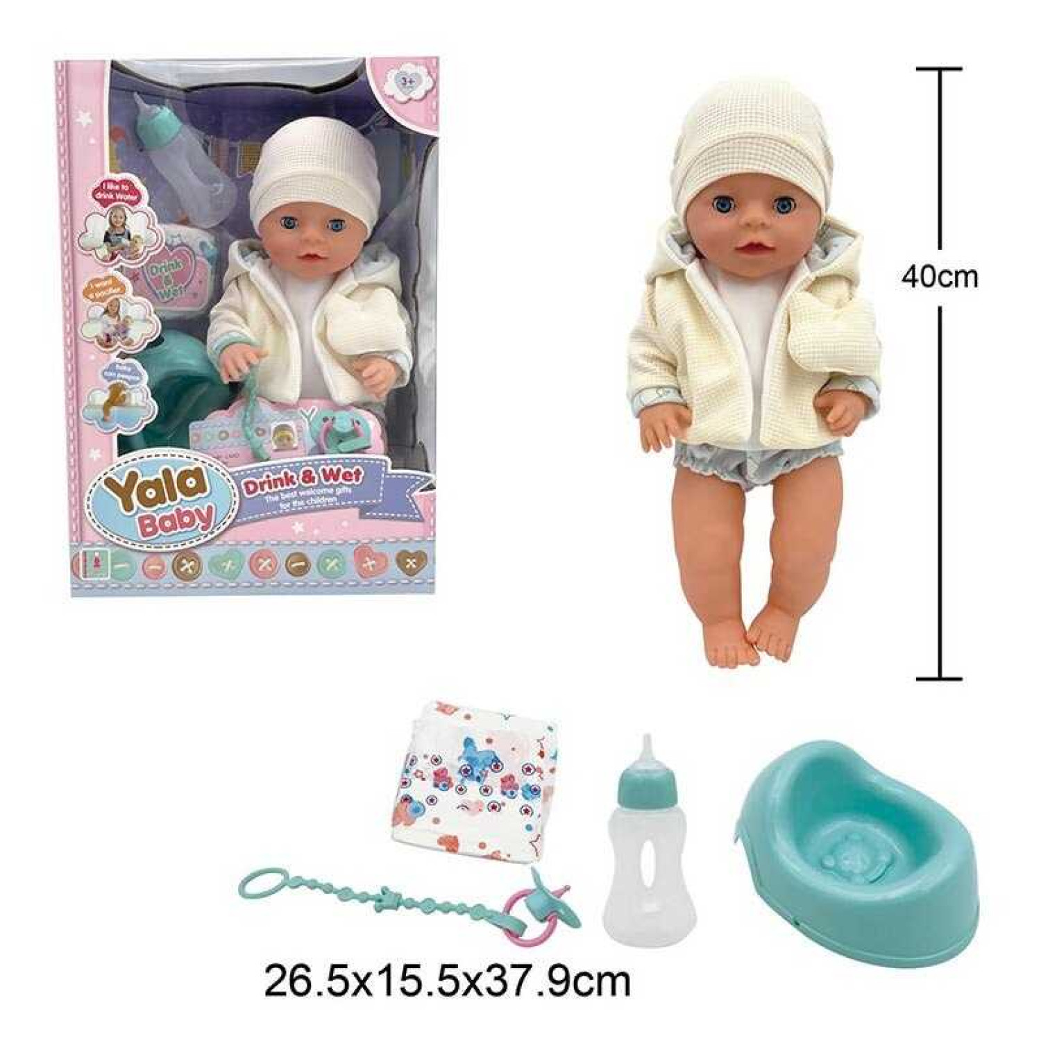 Особливості: Пупс з відмінною деталізацією. Має витончені риси обличчя. Заплющує очі. Пє з пляшечки. Ходить на горщик. Одягнений у знімний одяг. Має анатомічно правильні пропорції тіла. До комплекту входять додаткові аксесуари. Голова та кінцівки виконані з щільної гуми, а тіло - з пластику. Висота пупса - 40 см.
