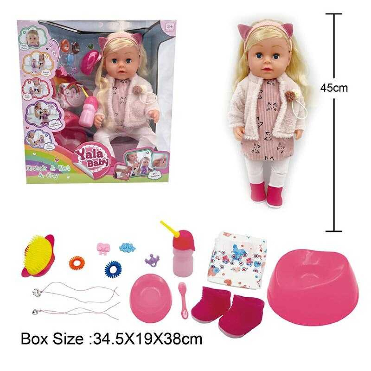 Особливості: Висота: 45 см. Плаче (при стисканні руки). Виразні пластикові очі. Пє з пляшечки. Ходить на горщик. Шарнірні суглоби на ногах. Тіло виконано з пластику, а голова, руки та ніжки - гумові. Рухливі кінцівки. Гарно прошите волосся. Може стояти на ногах. Знімний одяг. До набору додано багато аксесуарів.