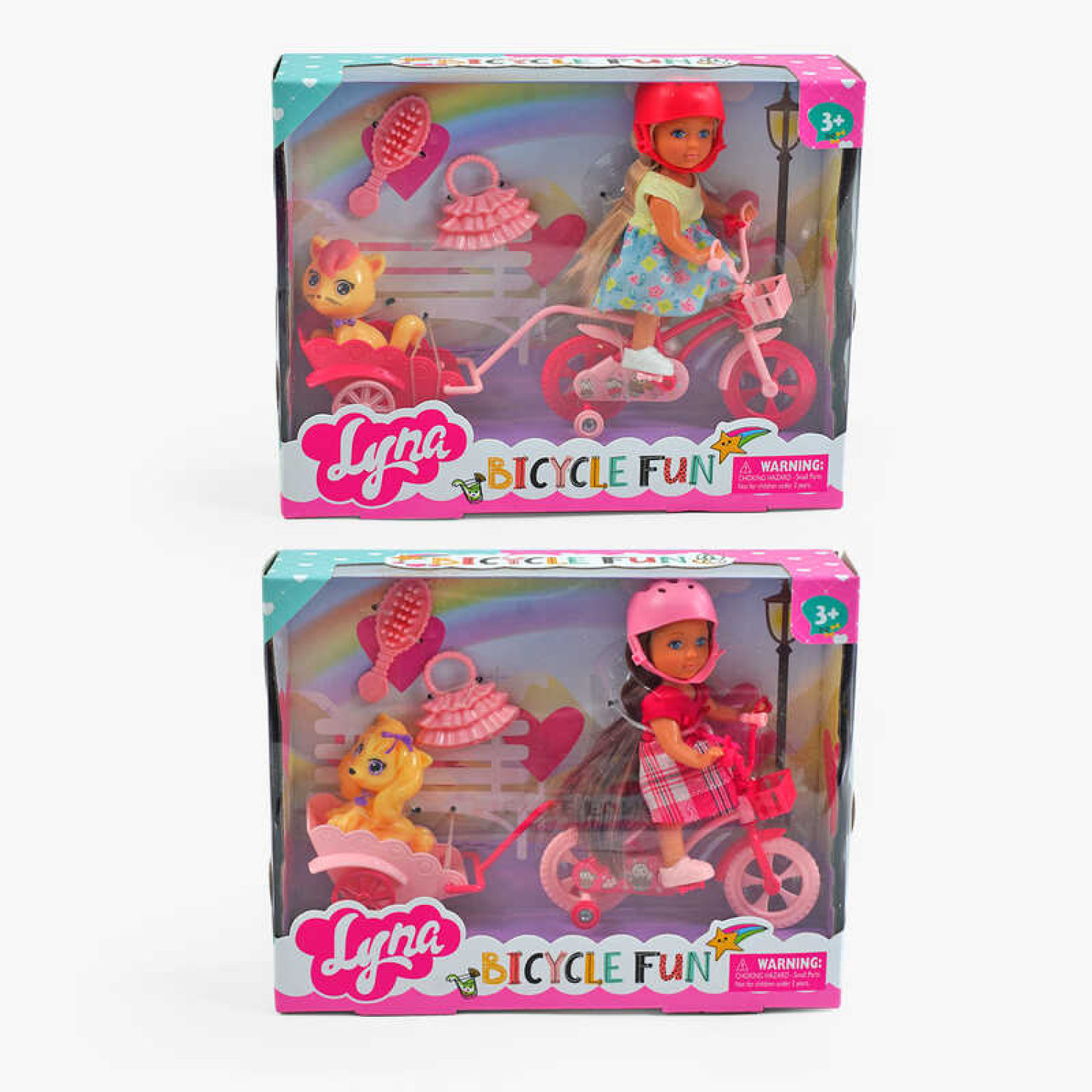 Особливості: Висота ляльки 12 см. Лялька виконана з пластику із гумовою головою. У іграшки рухливі кінцівки і голова. Лялька має довге та густе штучне волосся. У комплекті з лялькою йде пара знімних черевиків для неї. До набору додано аксесуари для ляльки та велосипед.
