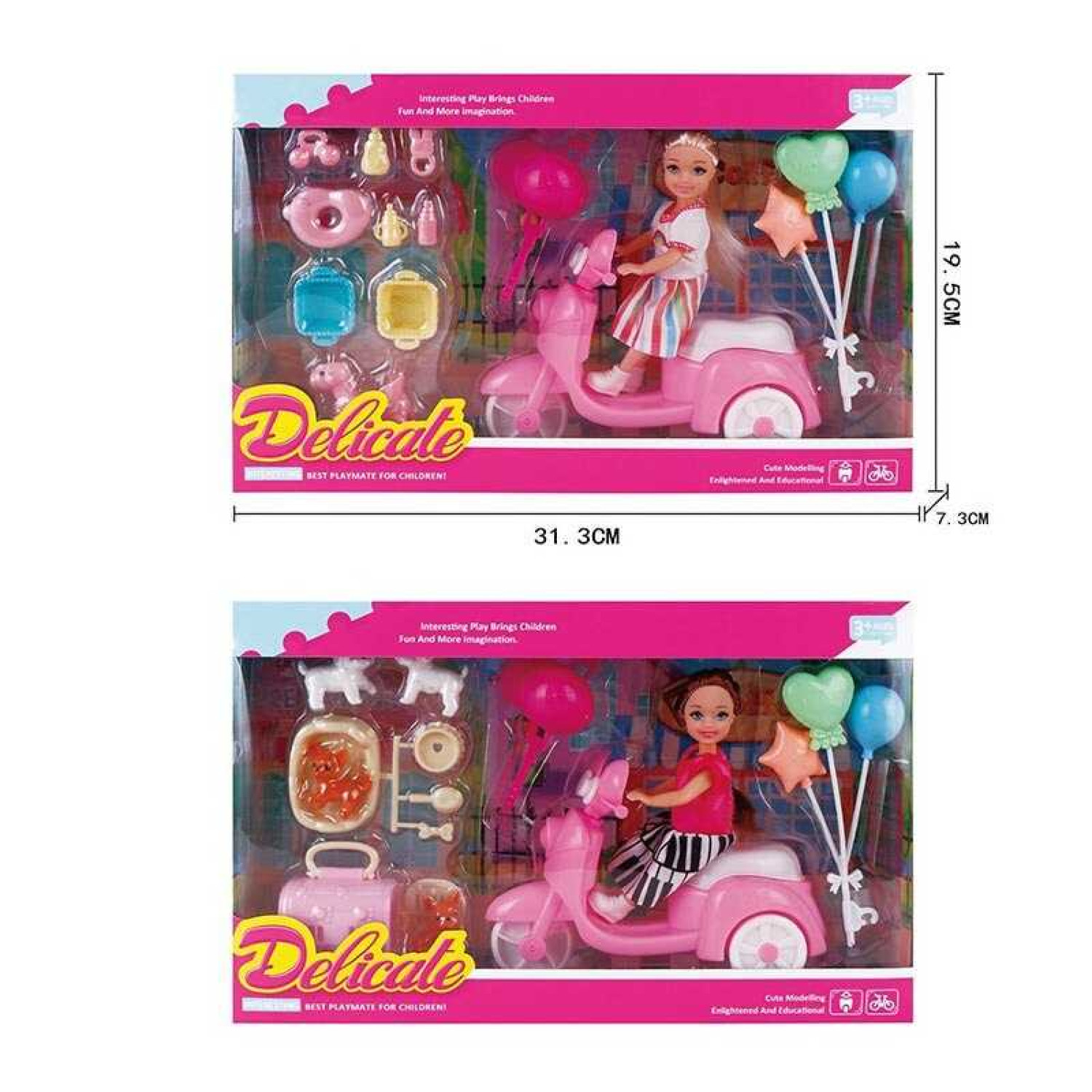 Лялька 2 види, "Прогулянка", скутер, шолом, висота ляльки 14см, повітряні кульки, 2 кошики, в кор. /72-2/