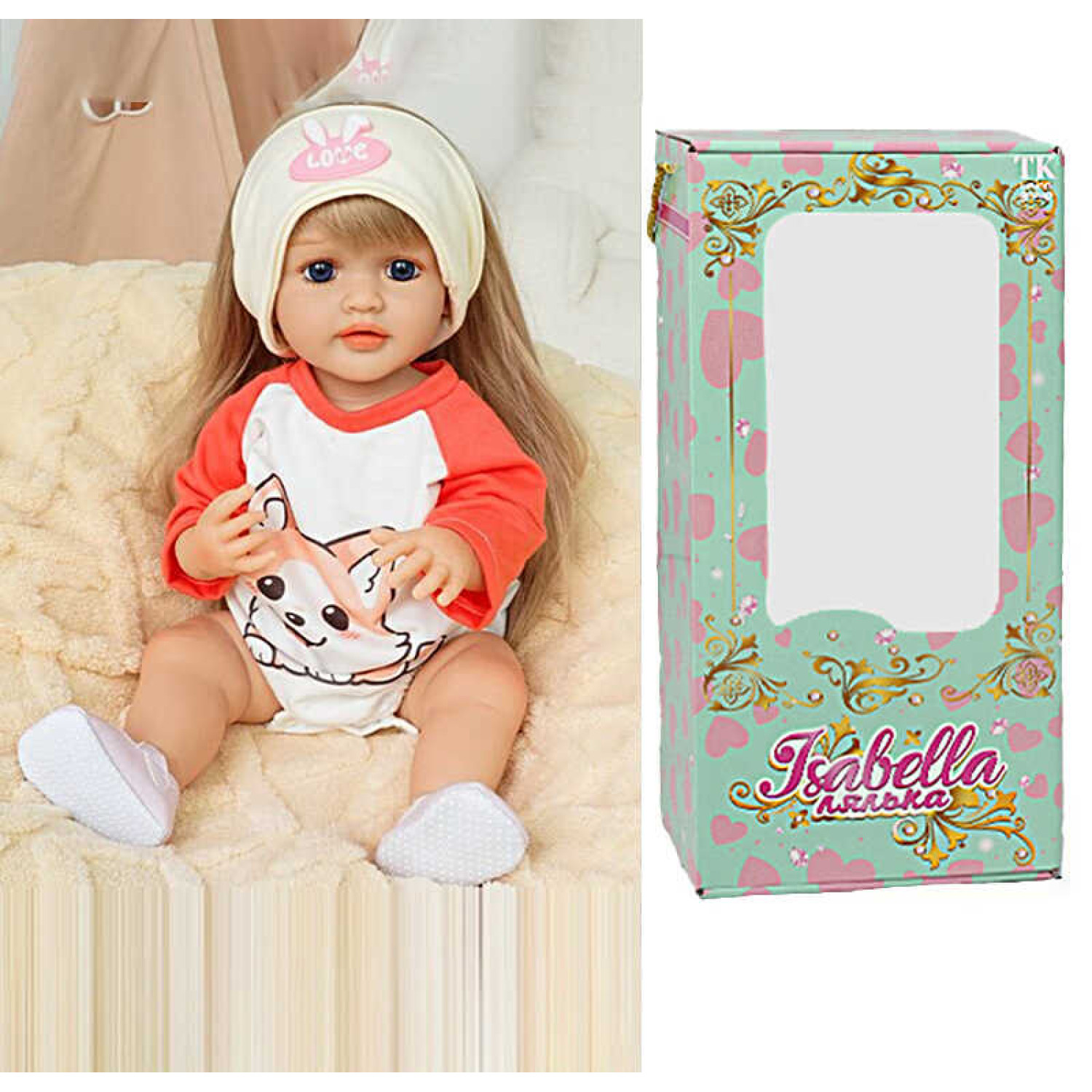 Особливості: Висота: 50 см. Лялька виконана з гуми. Імітація скляних очей. Довге й густе прошите волосся. Аксесуари у комплекті: магнітна пустушка, памперс, пляшечка, взуття, повязка на голову. Подарункове пакування.