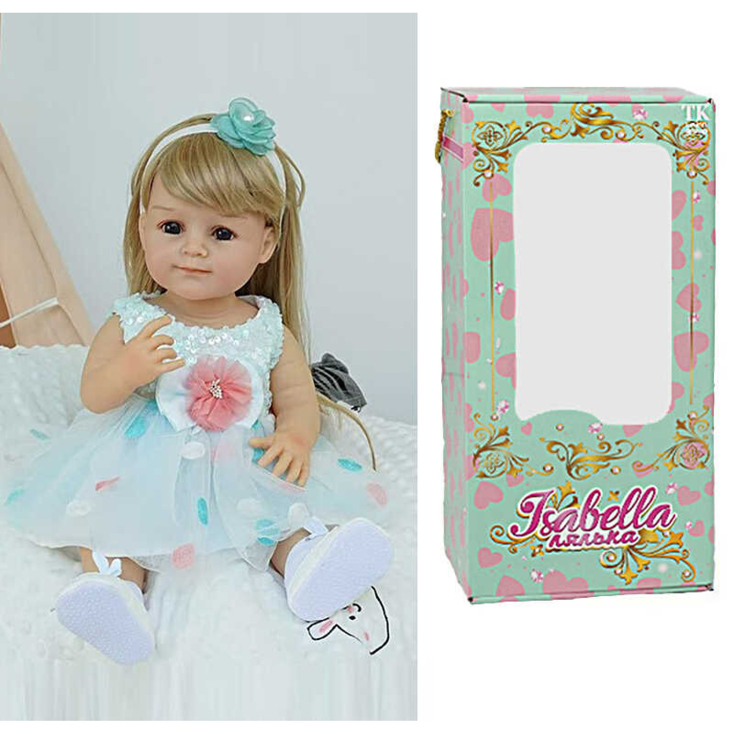 Особливості: Висота: 50 см. Лялька виконана з гуми. Імітація скляних очей. Довге й густе прошите волосся. Аксесуари у комплекті: магнітна пустушка, памперс, пляшечка, взуття, повязка на голову. Подарункове пакування.