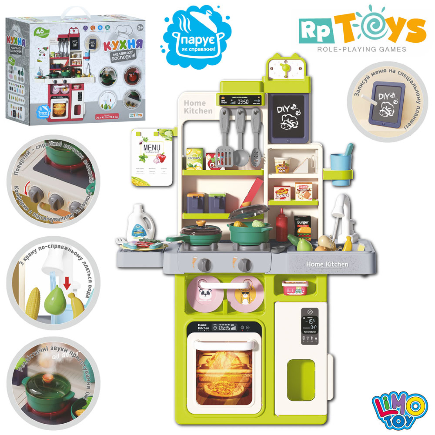Кухня 70-45-70,5см, плита, звук, світло, пара, духовка,мийка-ллється вода(механіч), посуд,продукти, дошка для малювання, крейда, губка, 46дет, на бат-ці, в кор-ці, 45-36-17см /8