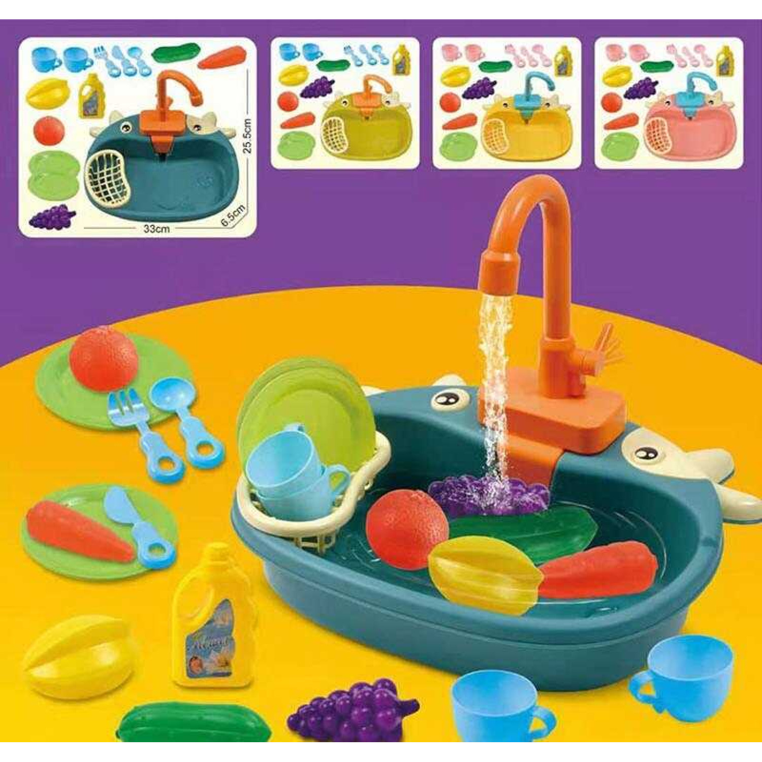 Цікавий набір кухонних аксесуарів, які дозволять дітям відтворювати процес миття посуду та весело проводити час. Мийка зроблена з високоякісного пластику і має кран, який можна вмикати та вимикати. Кран має функцію подачі води. Тип живлення - 2 батареї "АА" (не додаються). До набору додається посуд, прилади, продукти. Розмір: 25,5 * 33 * 6,5 см.