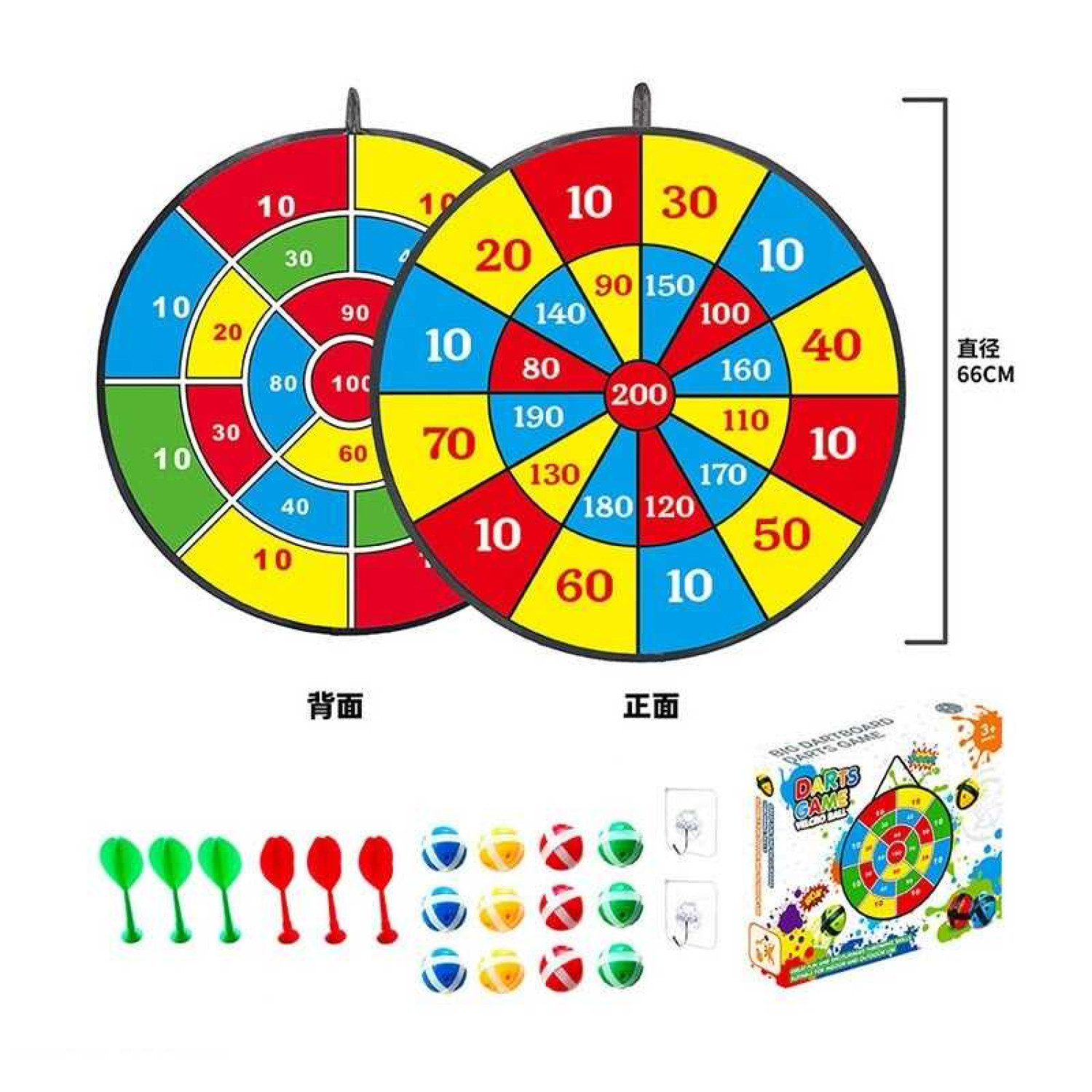 Особливості: Розмір мішені: 66х66 см. Двостороння текстильна мішень у вигляді кола із зонами з різною кількістю очків. 12 м'ячиків та 6 дротиків на липучках. Іграшка кріпиться на гачок. Гра має кольорове забарвлення. Тренує візуальне сприйняття. Ігрові елементи цілком безпечні для дітей та не мають гострих деталей.