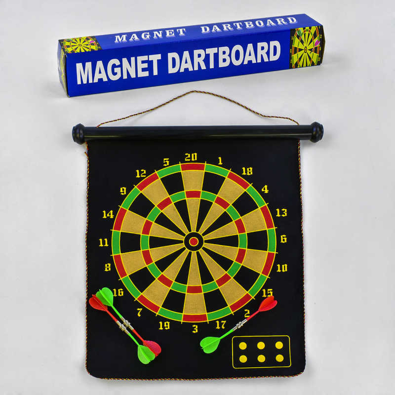 Дартс магнитный, упаковка - картонная коробка. В комплекте: мишень двухсторонняя на текстильной основе, 6 безопасных дротиков на магнитах. Размеры мишени: 50*41 см.