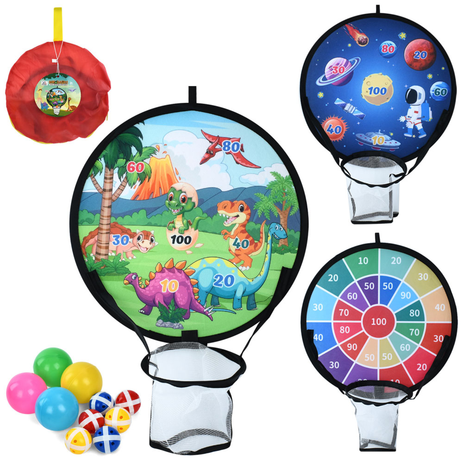 Дартс на липучці, 39см, 2в1(баскетбольне кільце 16см), м'ячики 6шт, кульки 4шт, 3 види, у сумці, 20-20-3см /24/