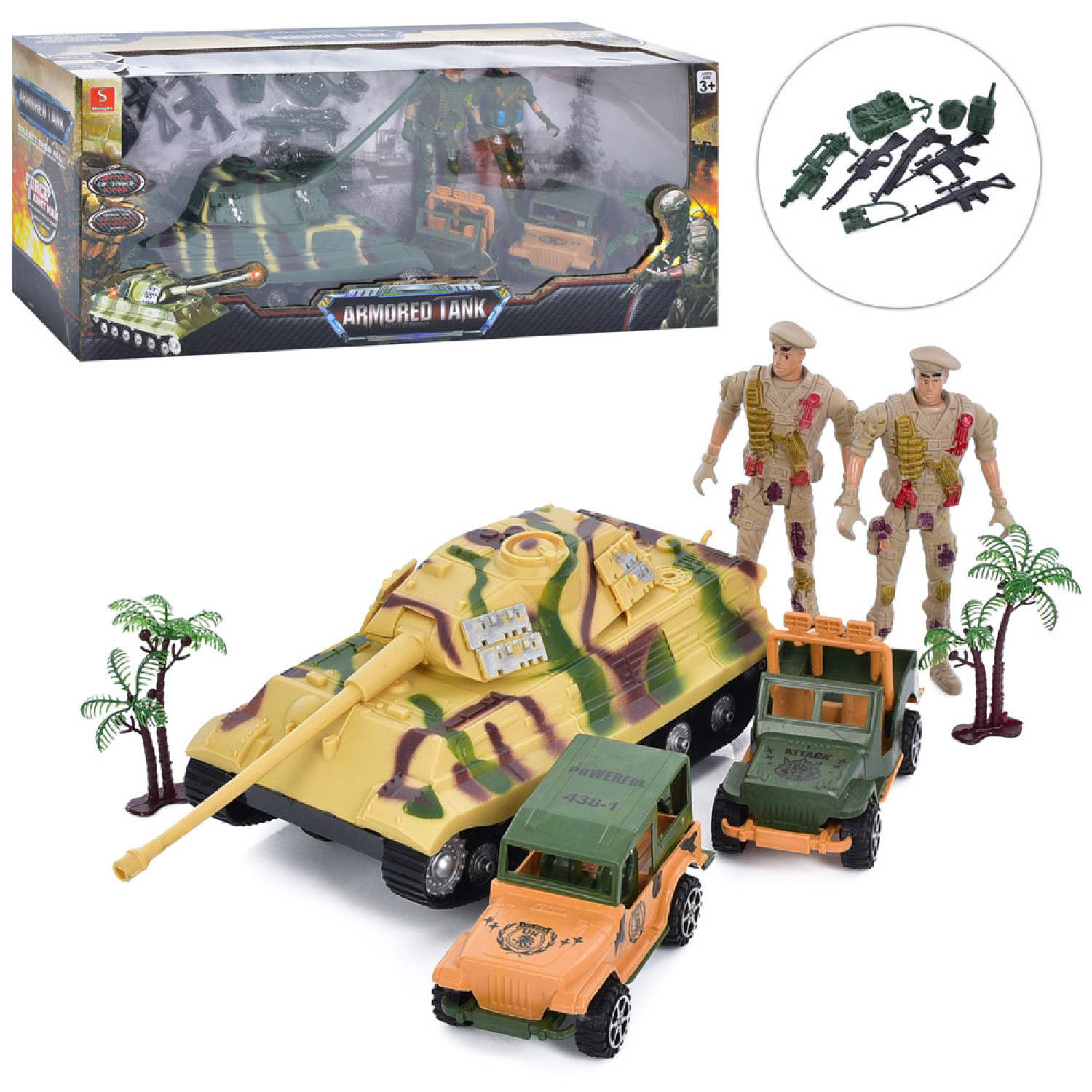 Набір з фігурками танк, машина (2шт), зброя, фігурка (2шт), 2 кольори, в кор-ці, 51-21-14см /18/