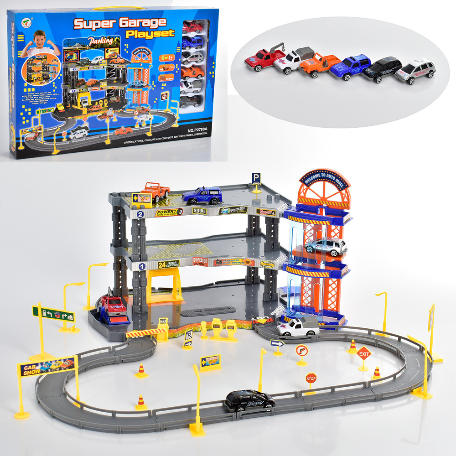 Гараж 3 поверхи, ліфт, машинки6шт, 6см, дорожні знаки, в кор-ці, 50-32,5-6,5см /12/