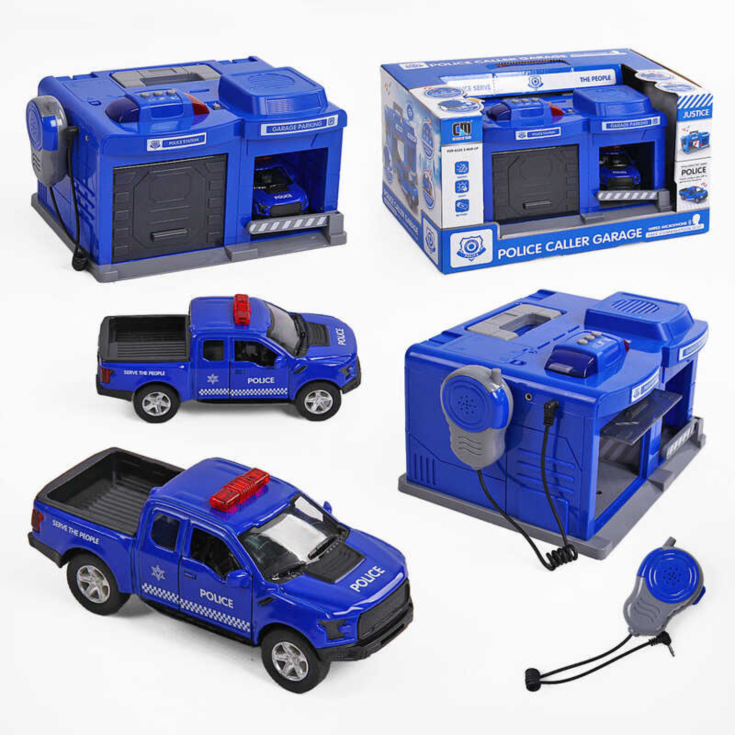На крышке есть ручка для переноски, внутри машинка. Шлагбаум подымается и опускается. Дверь гаража открывается вверх и задвигается внутрь. При включении срабатывают сигнальные огни и звучит мелодия 1 кнопка активирует: сигнал легковой машины и рев мотора 2 кнопка активирует сигнал грузовой машины и ее рев 3 кнопка включает разные сигналы. Рация транслирует информацию с крыши гаража. Работает от 3 батареек типа 1.5V «ААА» (нет в комплекте). Машинка работает от 3 батареек таблеток (в комплекте).