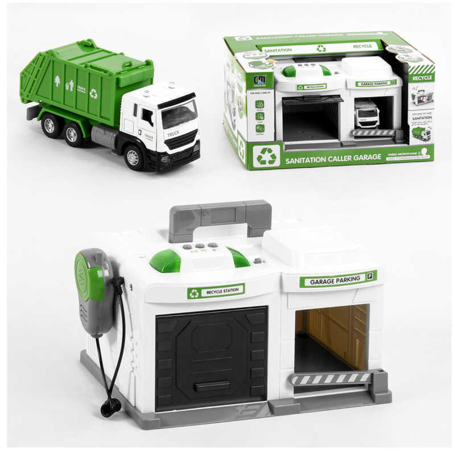Невеликий гараж з паркінгом для автомобіля виконаний в дуже сучасному стилі. На кришці є ручка для зручного перенесення конструкції, а всередині вже знаходитися невелика моделька спецтехніки. Вона обладнана звуковими ефектами, якщо Ви доторкнетеся до капота, то обов'язкова спрацює сигналізація і засвітяться фари. Моделька варто на стоянці за шлагбаумом, який вільно підіймається та опускається. Двері гаража відкриваються вгору, потім засувається всередину. При активації ефектів іграшки, в гаражі з'явитися приємний білий світ. На даху конструкції розташовуються сигнальні вогні, кнопки зі звуковими ефектами, передавач, кнопка активації ефектів, а також рація. Звукові ефекти: - при включенні спрацьовують сигнальні вогні та звучить коротка весела мелодія, - 1 кнопка активує: сигнал легкової машини й рев мотора, - 2 копка активує сигнал вантажної машини і її рев, - 3 кнопка включає різні сигнали оперативних служб. Рація що перебувати збоку активна, беріть її в руки, натискайте на кнопку і говорите. Ваше послання буде передано і трансльовано прямо з даху Вашого гаражного комплексу. Гараж працює від 3 батарейок типу 1.5V "ААА" (не входять в комплект). Машинка працює від 3 батарейок таблеток (входять в комплект).