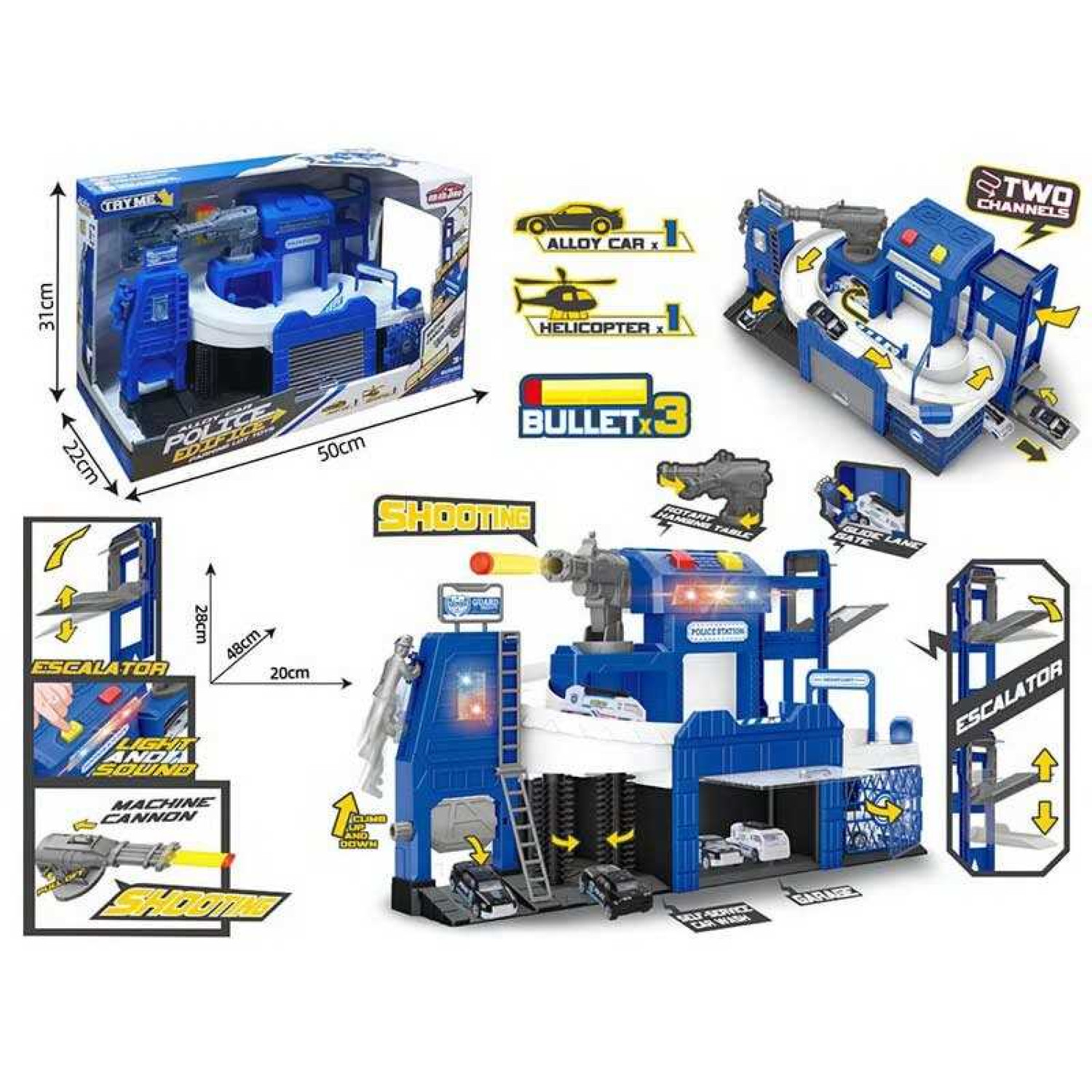 Парковка трек, механічний підіймач, підсвічування, звуки, на батарейках, рухомі елементи, металопластикова машинка та гелікоптер, механічна пушка, 3 м’яких патрони, в кор. /8-2/