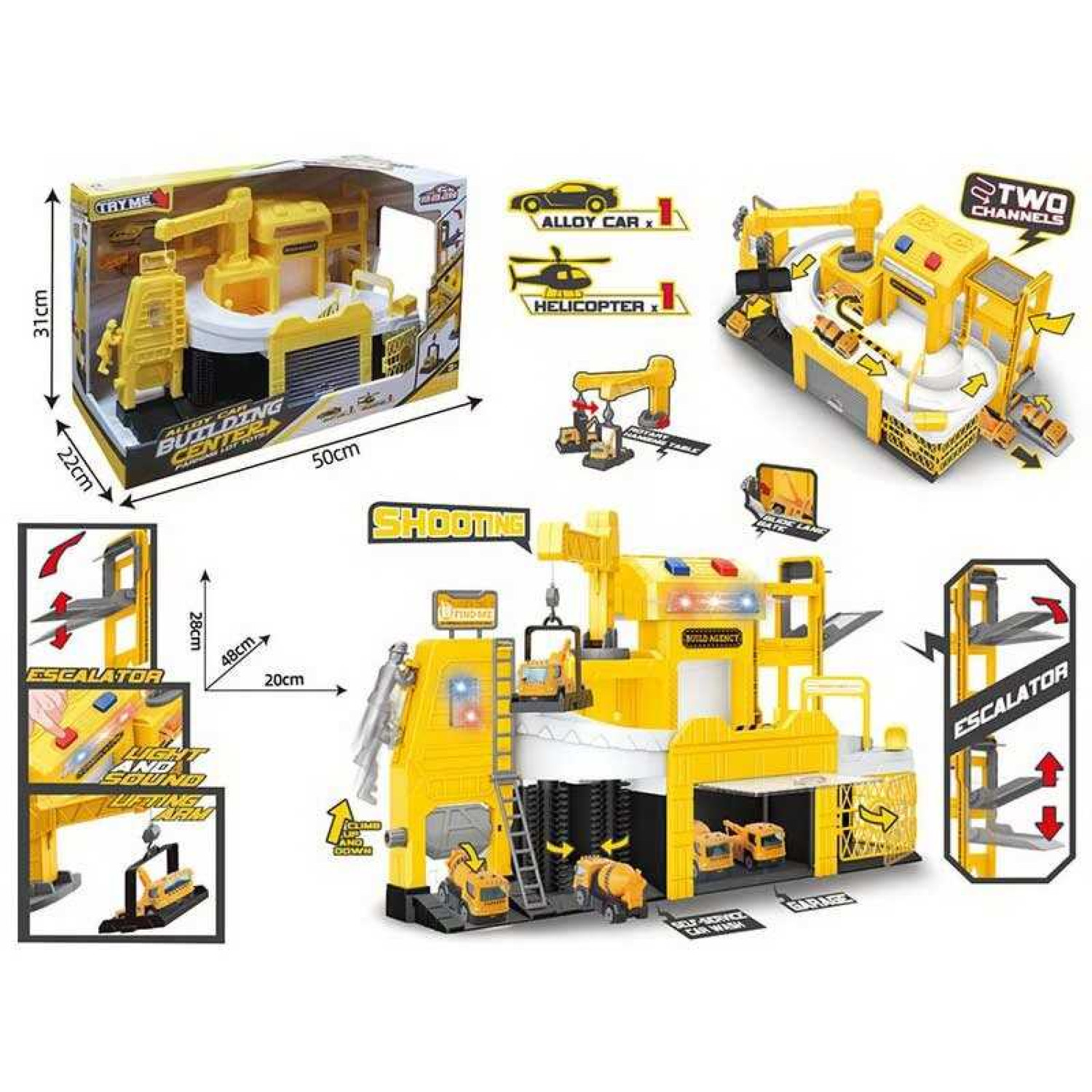 Парковка трек, механічний підіймач, підсвічування, звуки, на батарейках, рухомі елементи, металопластикова машинка та гелікоптер, механічний кран, в кор. /8-2/