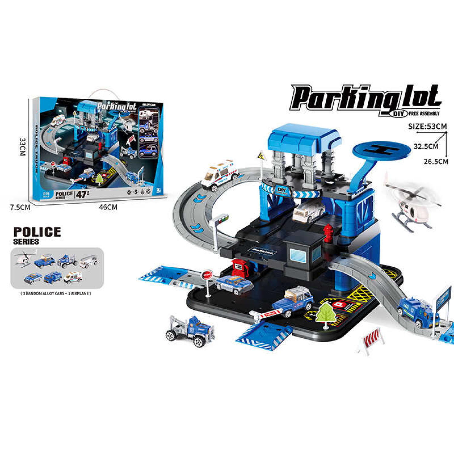Трек 3 металопластикові машинки, гелікоптер, 3 рівні, муляжі оточення, наліпки, в кор. /24/