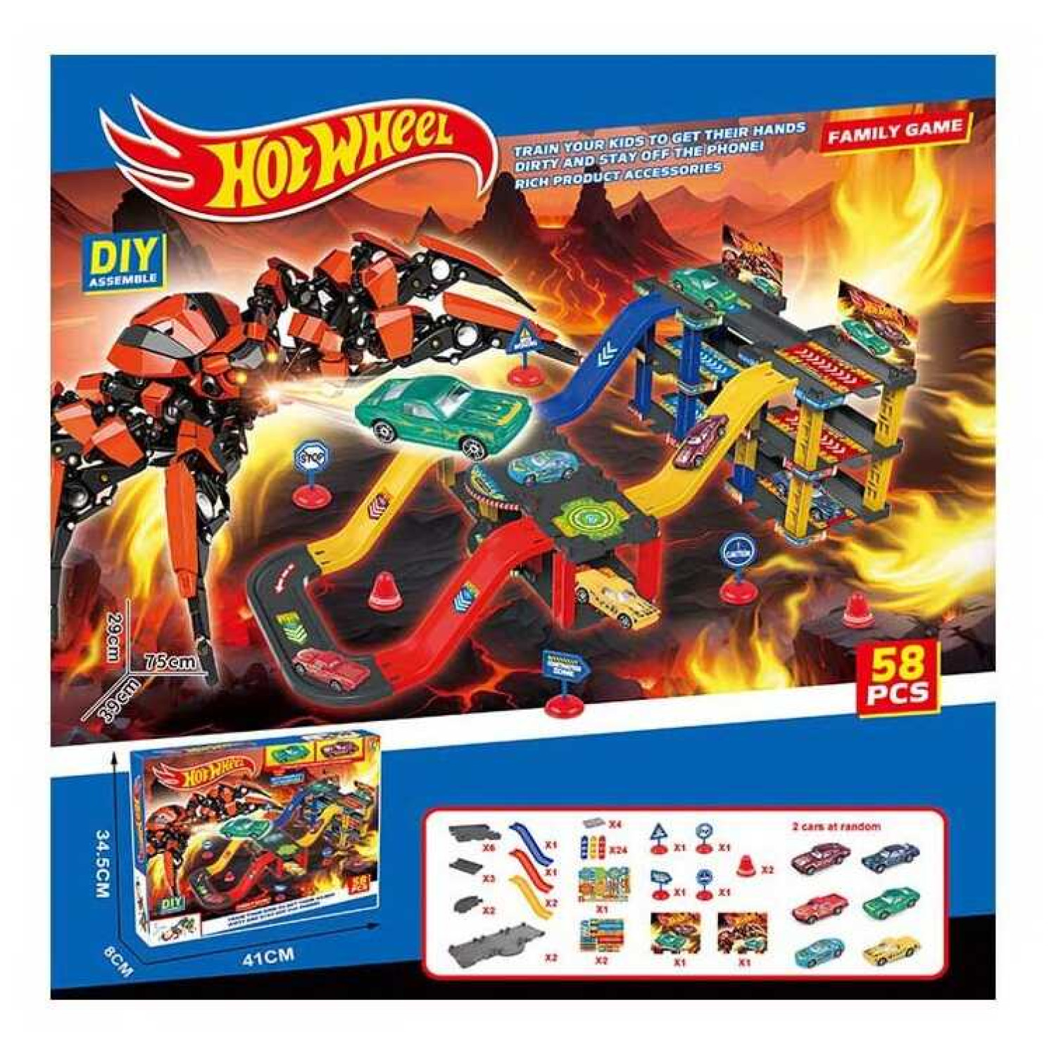 Трек 58 елементів, довжина 75см, 2 металопластикові машинки, 3 поверхи, парковка, дорожні знаки, в кор. /36/