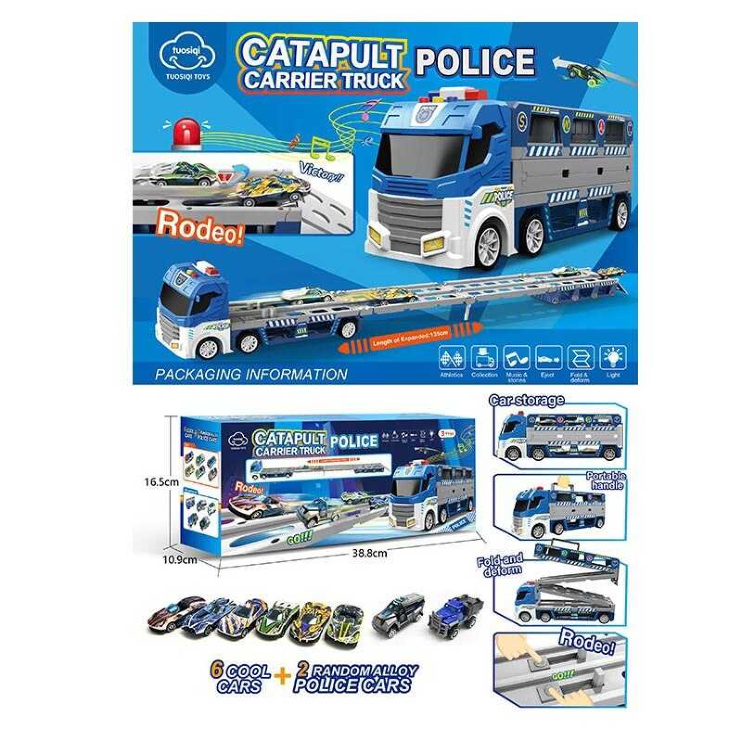 Трейлер-трек "Поліція", розмір 38х10.5х15 см, довжина треку 135 см, механічний запусач, підсвічування, звук, 2 металопластикові моделі, 6 пластикових моделей, в кор. /36/