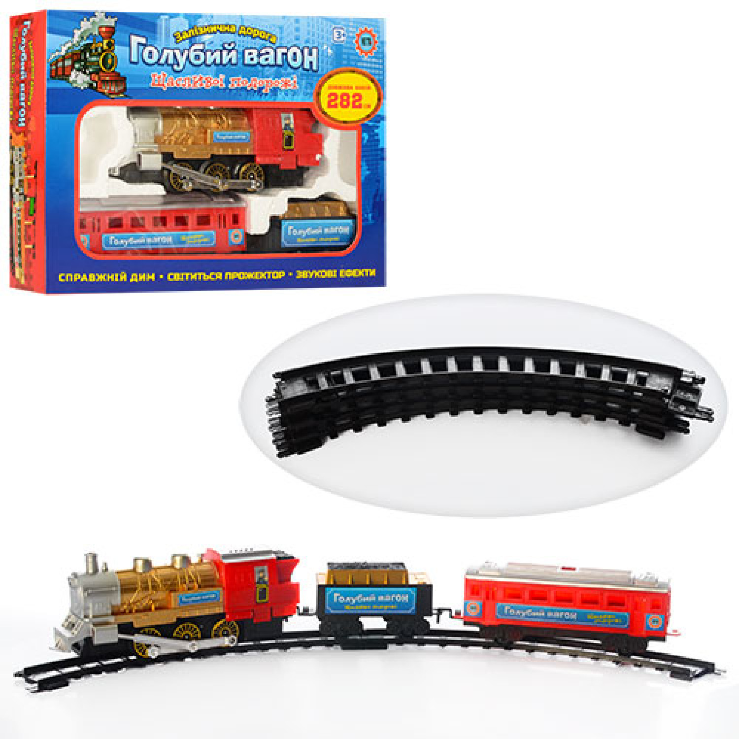 Железная дорога "Мой 1-й поезд", упаковка - картонная коробка с блистером. В комплекте: элементы железнодорожного пути, локомотив, 2 вагона. Длина дороги - 282 см. Особенности: звук, свет, дым. Источник питания - батарейки. Материал - пластик.