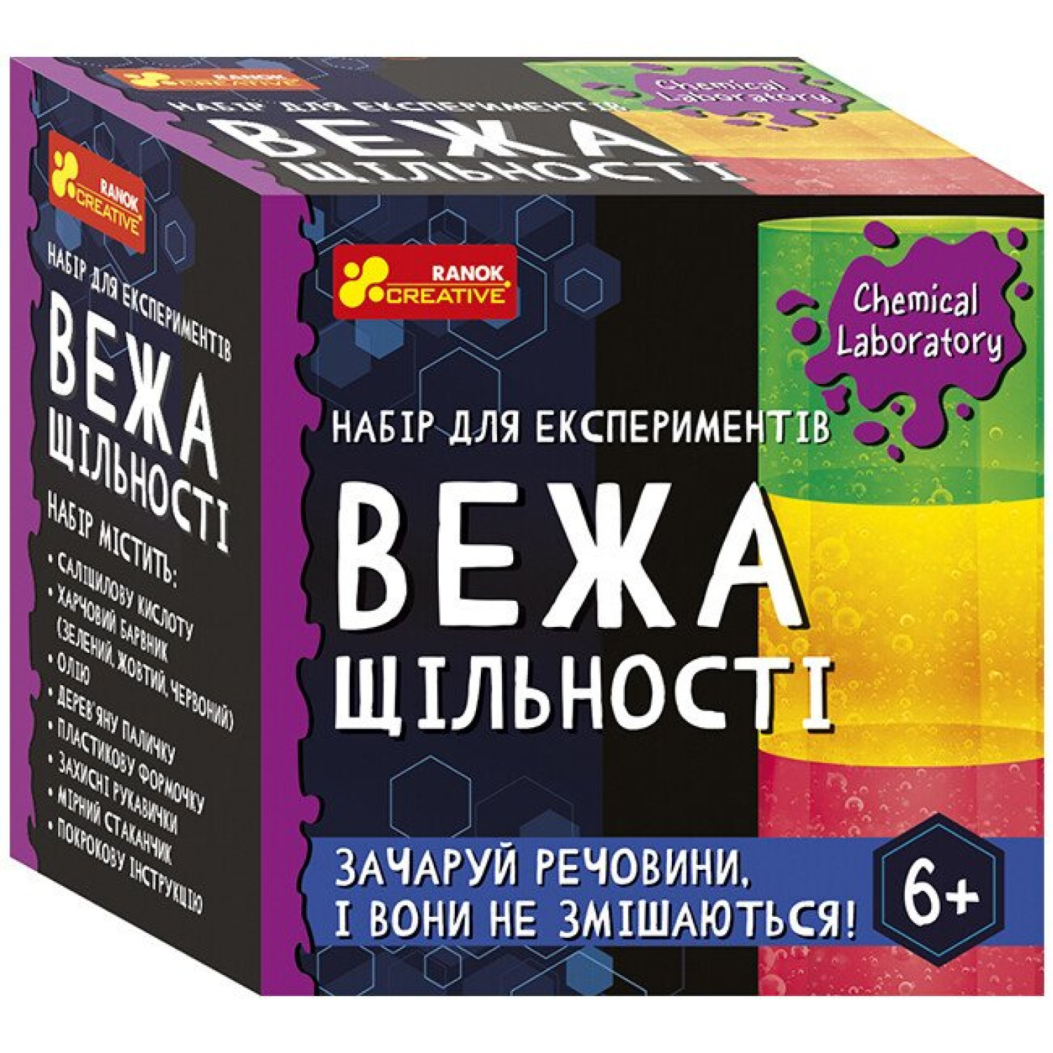 Набір містить: саліцилову кислоту, харчовий барвник (зелений, жовтий, червоний), олію, деревяну паличку, пластикову формочку, захисні рукавички, мірний стаканчик, покрокову інструкцію. Вік: 6-10 років. Упаковка: коробка 8х8х5 см.