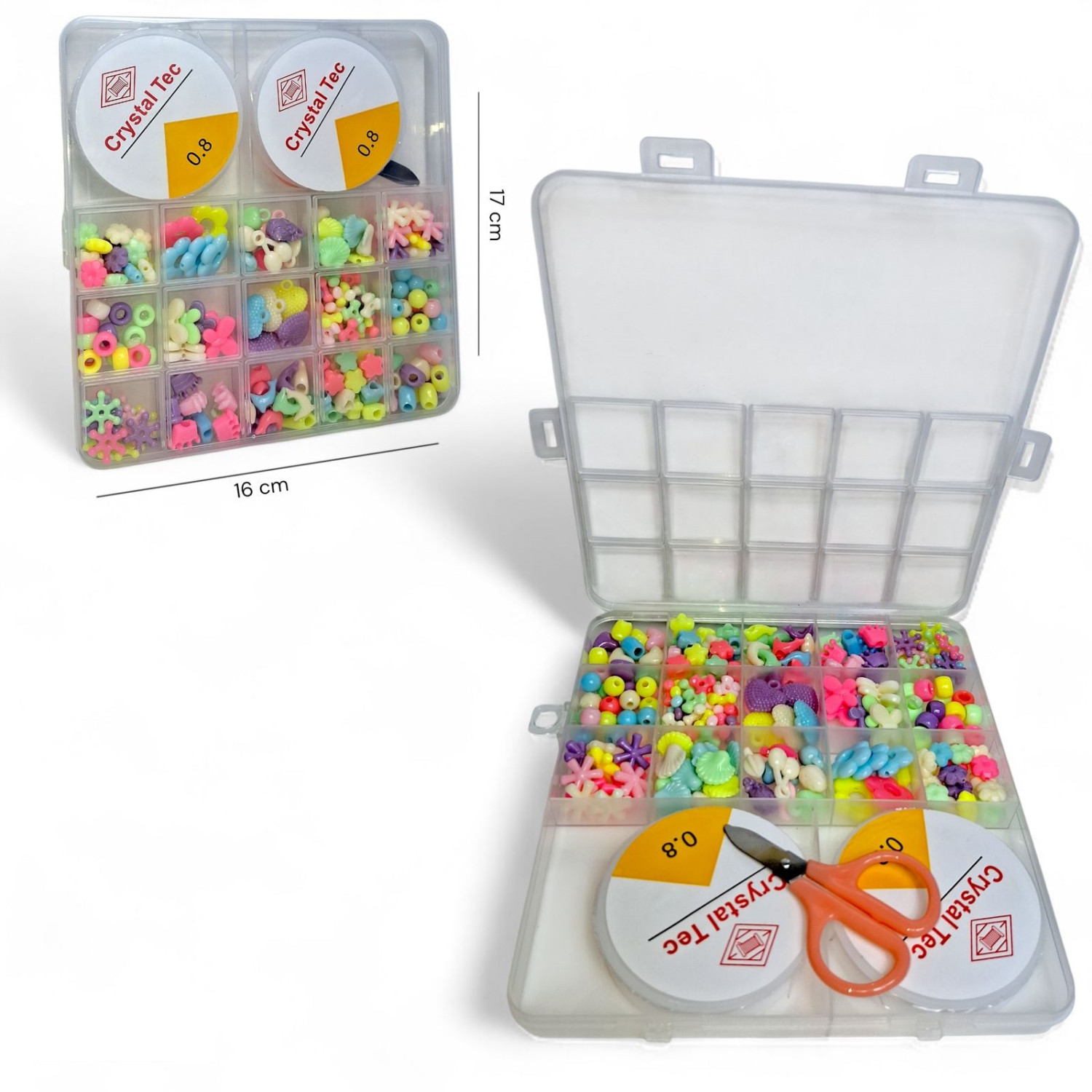 Особливості: В наборі пластикові бусини різної форми, розміру та кольору. В комплекті ножиці та нитки. Упаковка: пластиковий бокс 16х17 см.