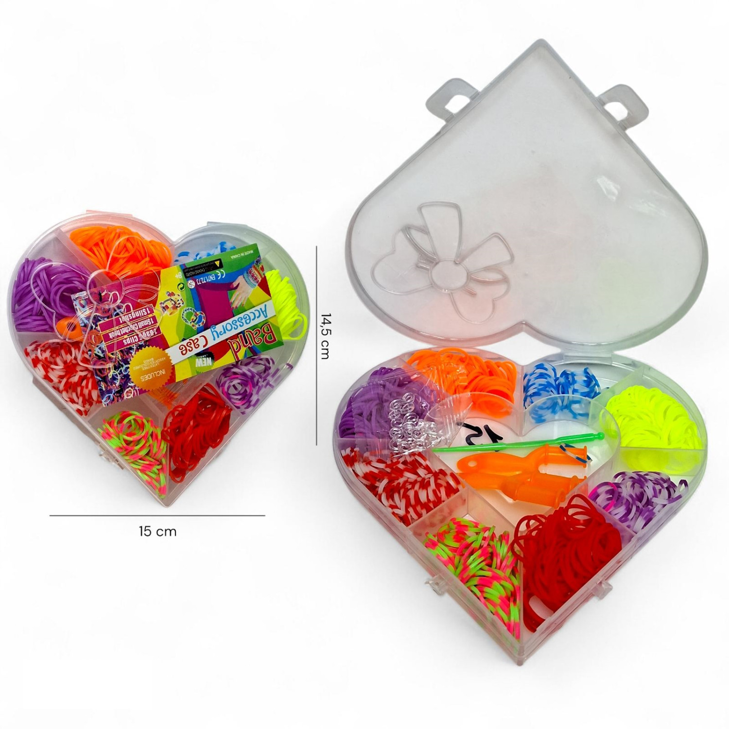 Набір резиночок для плетіння. В комплекті: різнокольорові гумки, станок, гачок для плетіння, гачки для прикрас. Упаковка: пластиковий бокс у формі серця.